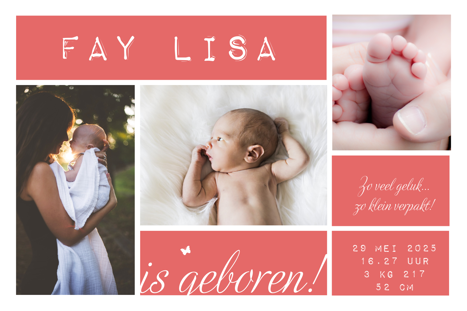 Met dit foto geboortekaartje als basis kun je nu zelf een foto geboortekaartje ontwerpen. Plaats mooie foto's van je kindje in de stoere fotoblokken op de voor- en achterkant. Krijg je in plaats van een meisje een jongetje? Pas de kleuren aan en maak zo een echt jongens geboortekaartje.
