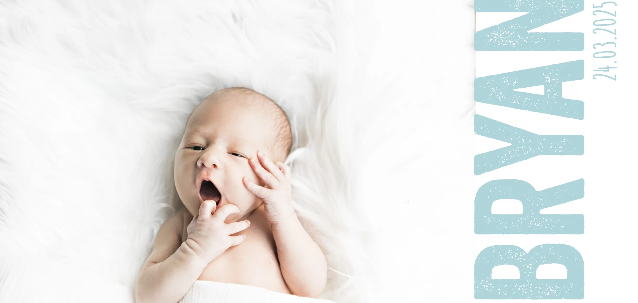 Maak zelf een eenvoudig geboortekaartje op deze enkele kaart in panorama-model. Naast de foto staat de naam dwars in stoere blauwe letters, de kleur van de tekst kun je terug laten komen in het kleurvlak op de achterkant. Kies zelf kleuren en typografie en maak een mooi persoonlijk ontwerp!