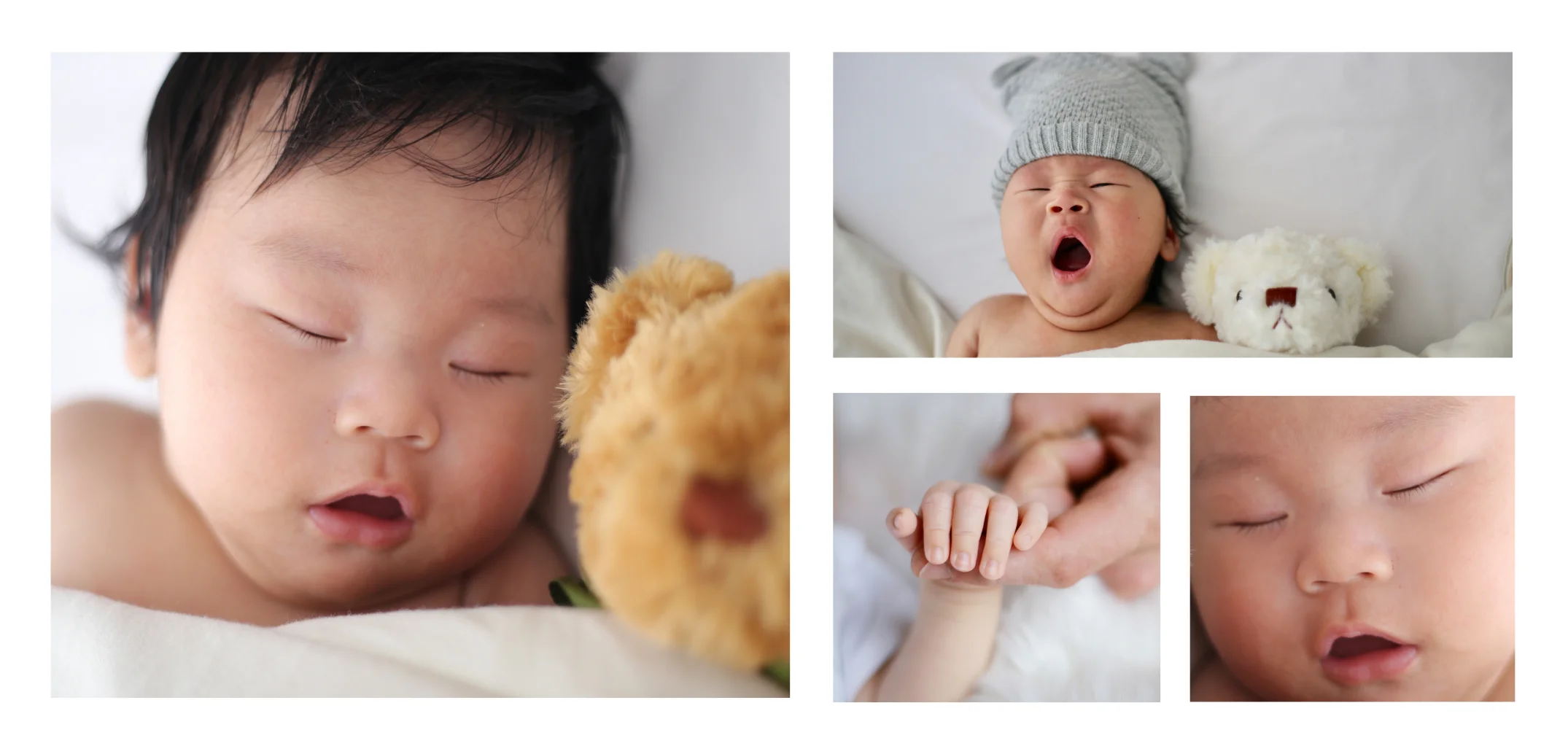 Vervang de foto's voor de foto's van je eigen newborn-shoot. Op deze dubbele panoramakaart is ruimte voor een fotocollage van vier foto's.