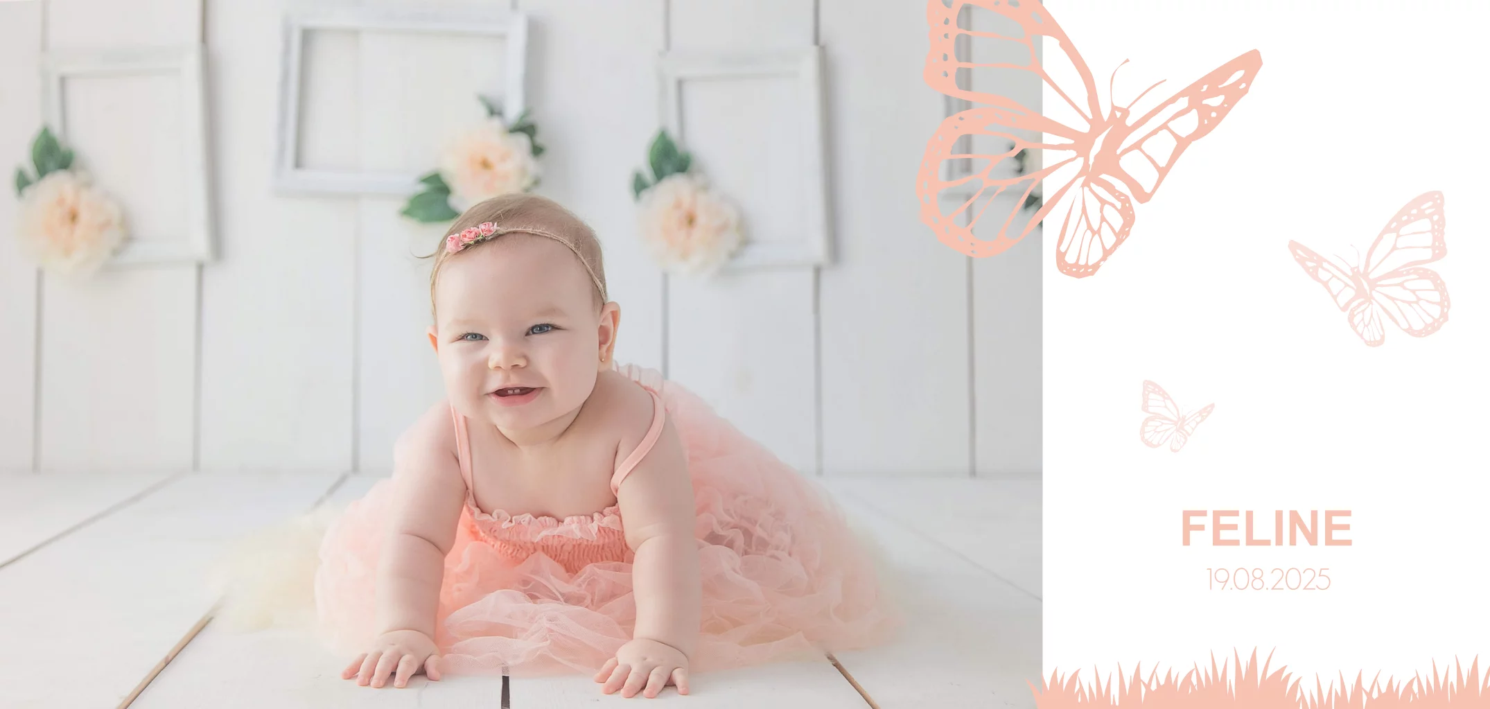 Ontwerp zelf een lief geboortekaartje op deze panoramakaart. Met een foto van jullie kleine op de voorkant maak je er meteen een unieke kaart van. De tekst en vlinders zijn in dezelfde kleur, dat maakt het een geheel. Op de achterkant staat ook een vlinder boven een grasveld. Pas het ontwerp geheel naar eigen wens aan in de online editor.