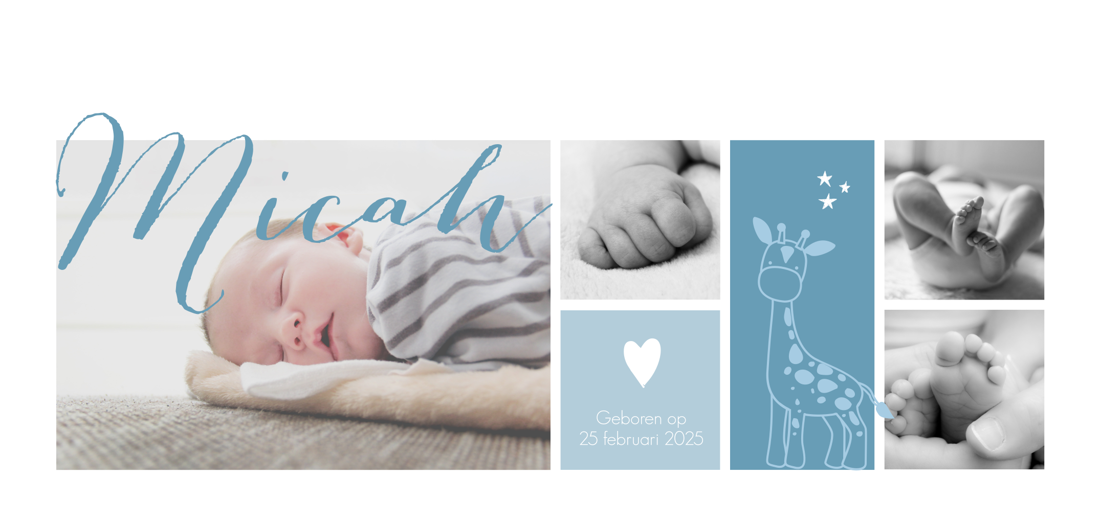 Maak je eigen geboortekaartje aan de hand van dit voorbeeld met tekst- en fotovlakken. Op de voorkant is plaats voor een collage van foto's en op de achterkant kun je ook nog een foto plaatsen. In de lichtblauwe vlakken staat een tekening van giraffe en een hartje. Speel met kleuren en lettertypes in de online editor en maak zo een persoonlijk ontwerp!
