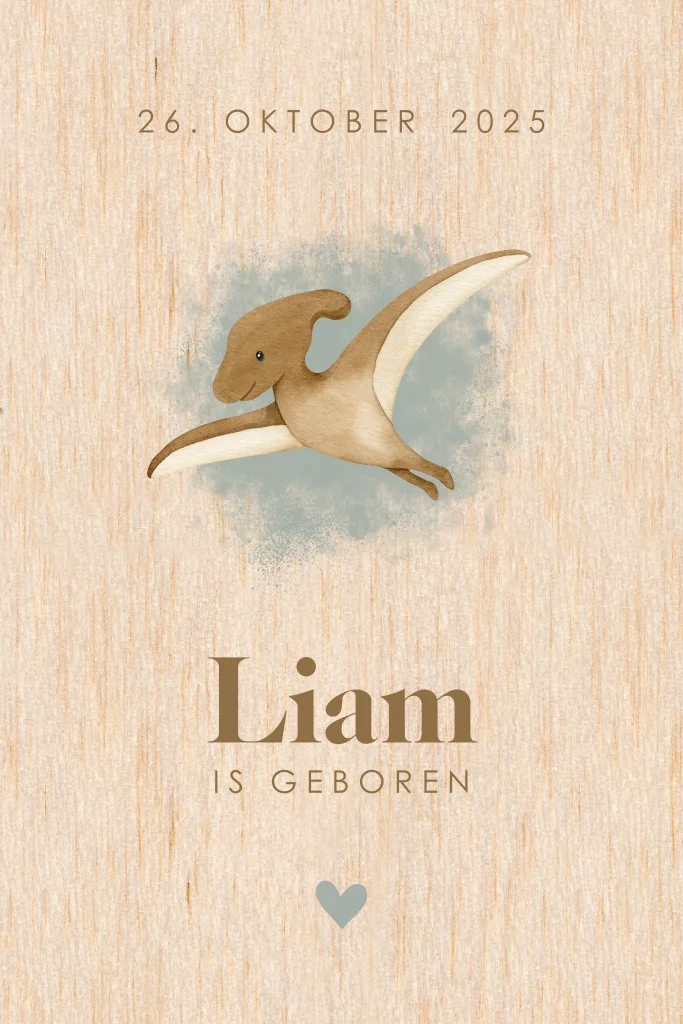 Schattig geboortekaartje van echt hout met een schattige dino die door de lucht vliegt. Het geboortekaartje is gemaakt van multiplex hout en afgeronde hoeken.
