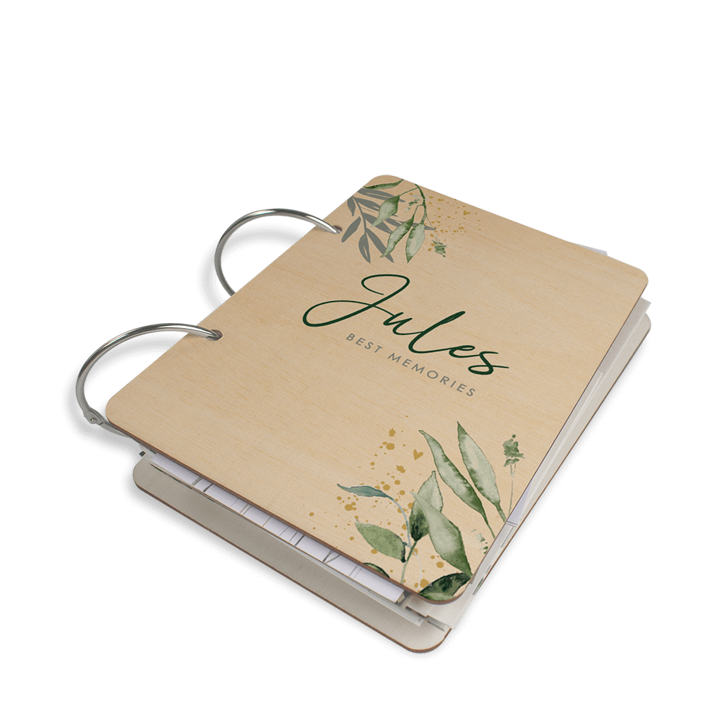 Avontuurlijke bewaarbundel met groene eucalyptus takjes en de naam van jullie kleintje in het midden. De bewaarbundel is gemaakt van multiplex hout, heeft afgeronde hoeken en twee metalen ringen.