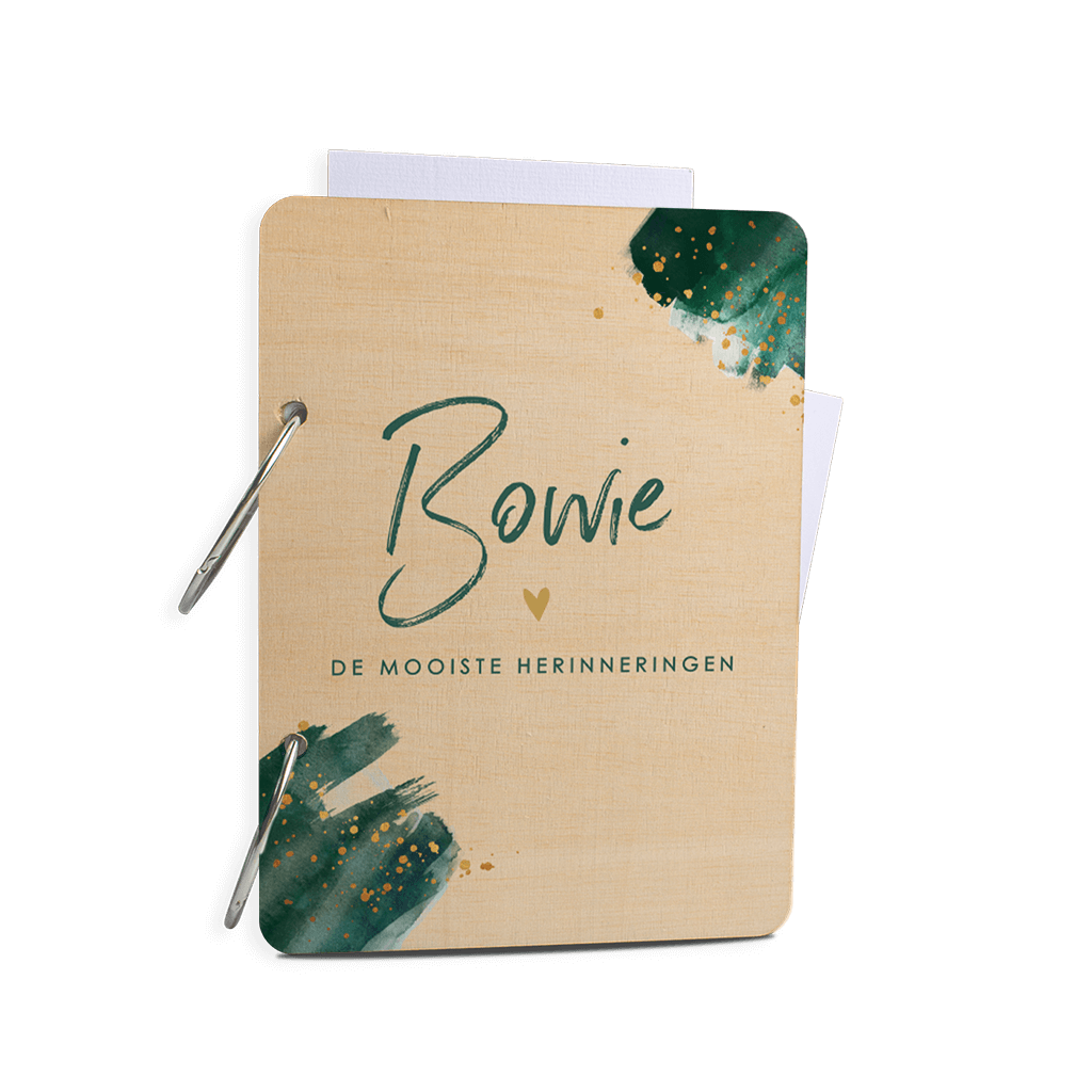 Vrolijke bewaarbundel met groene watercolour vlekken en gouden verfspetters. De bewaarbundel is gemaakt van multiplex hout, heeft afgeronde hoeken en twee metalen ringen.