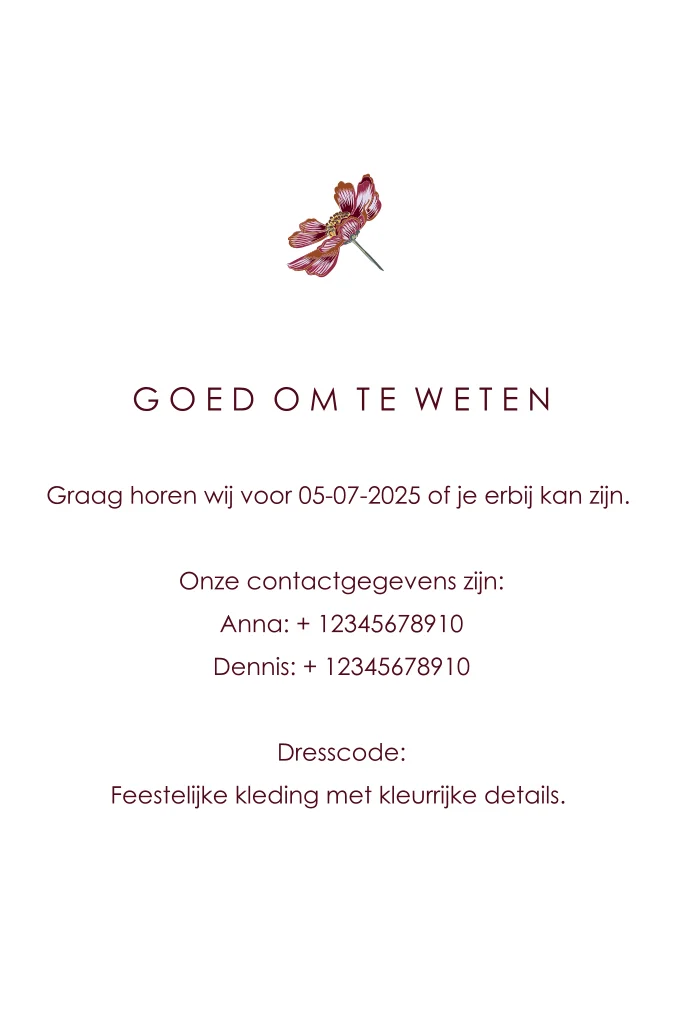 Inlegvel met illustratie van een donkerroze bloem, die ook op de achterzijde terugkomt. De tekst is in dezelfde kleur als de bloem en kan naar wens worden aangepast in de online editor.