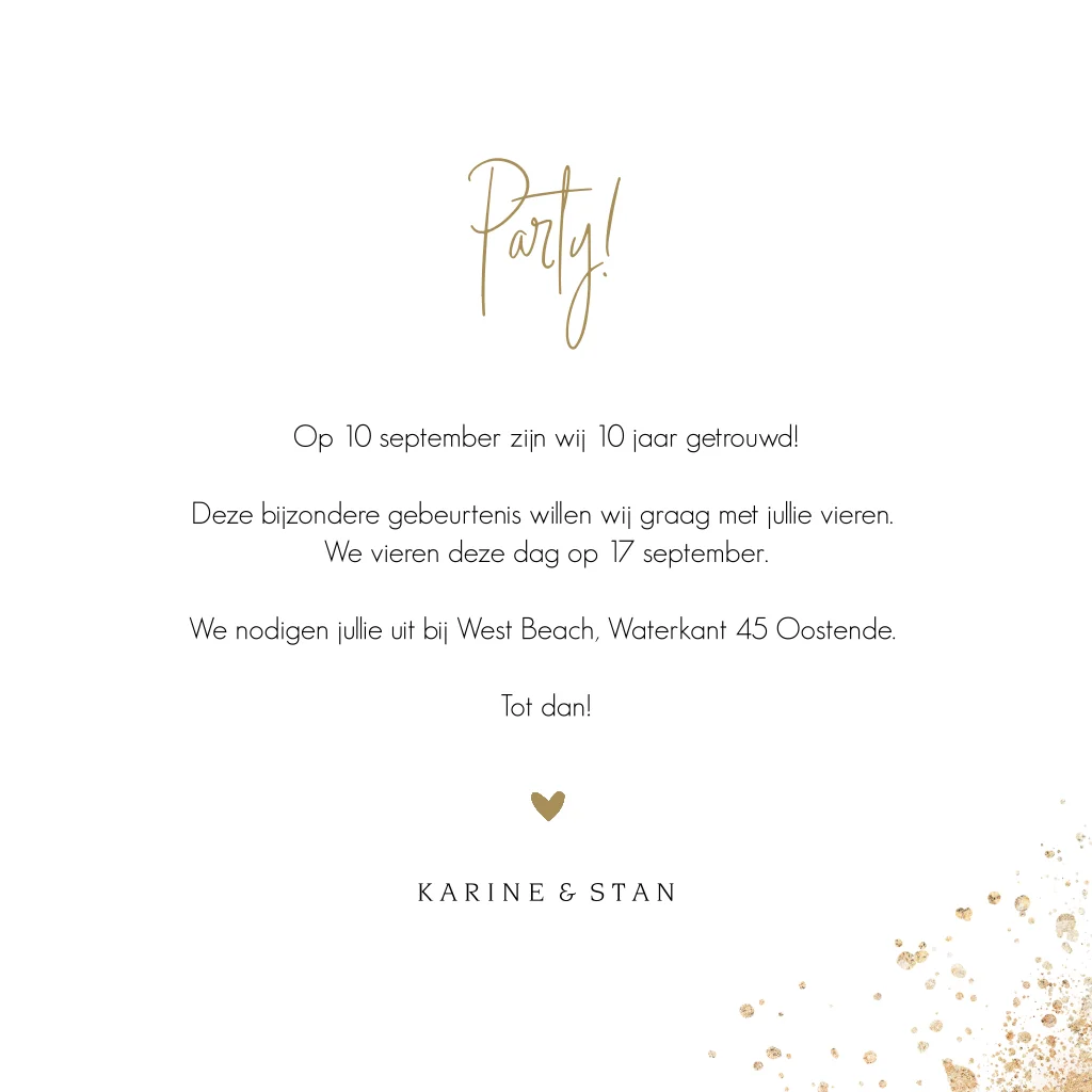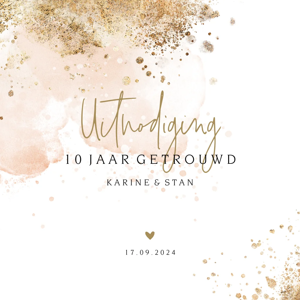Stijlvol kaartje om familie en vrienden uit te nodigen voor jullie huwelijksjubileum. Op een achtergrond van roze watercolour staan goudspetters, de tekst is in bijpassende kleuren met een klein hartje eronder.