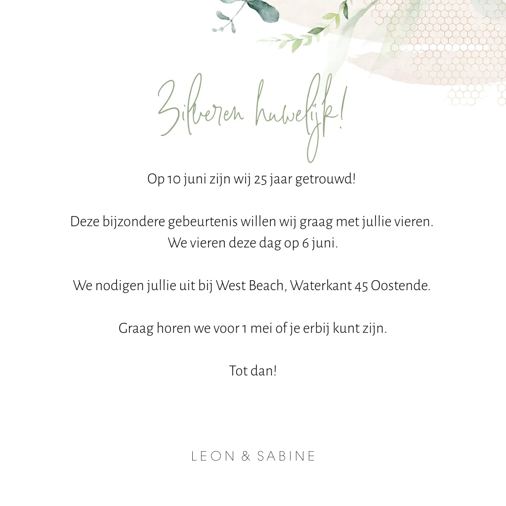 Stijlvolle uitnodiging voor een huwelijksjubileum, met een waterverf vlak met eucalyptustakjes. Voor de takjes kan een eigen foto worden toegevoegd in de online editor, daar pas je ook de teksten eenvoudig zelf aan. Het takjesdesign komt ook terug aan de binnenzijde en de typografie is in bijpassende kleuren.