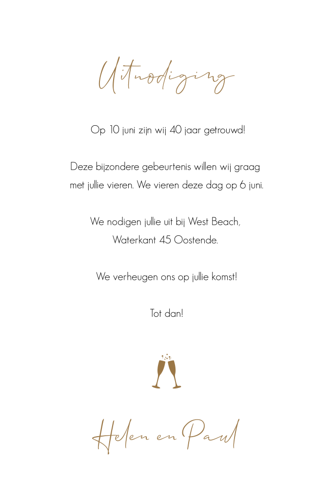 Stijlvolle uitnodiging voor een 40-jarig huwelijksfeest, op een pastel roze achtergrond staat de tekst in sierlijk lettertype in bruin. Op de voorkant kan een eigen foto worden geplaatst, onder de foto staan twee klinkende champagneglazen, tijd voor een feestje!