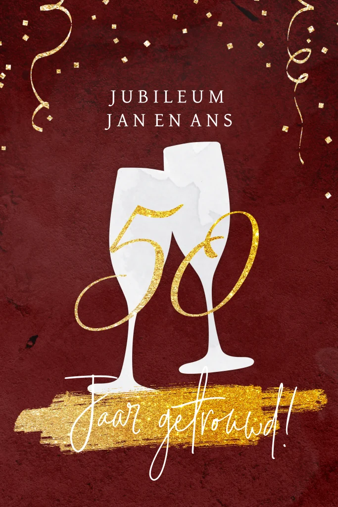 Een feestelijke, donkerrode uitnodiging voor jullie 50-jarig huwelijksjubileum. De kaart heeft een design met champagneglazen, confetti en gouden details. Pas de tekst aan in de online editor en de kaart is klaar voor verzending naar de genodigden!