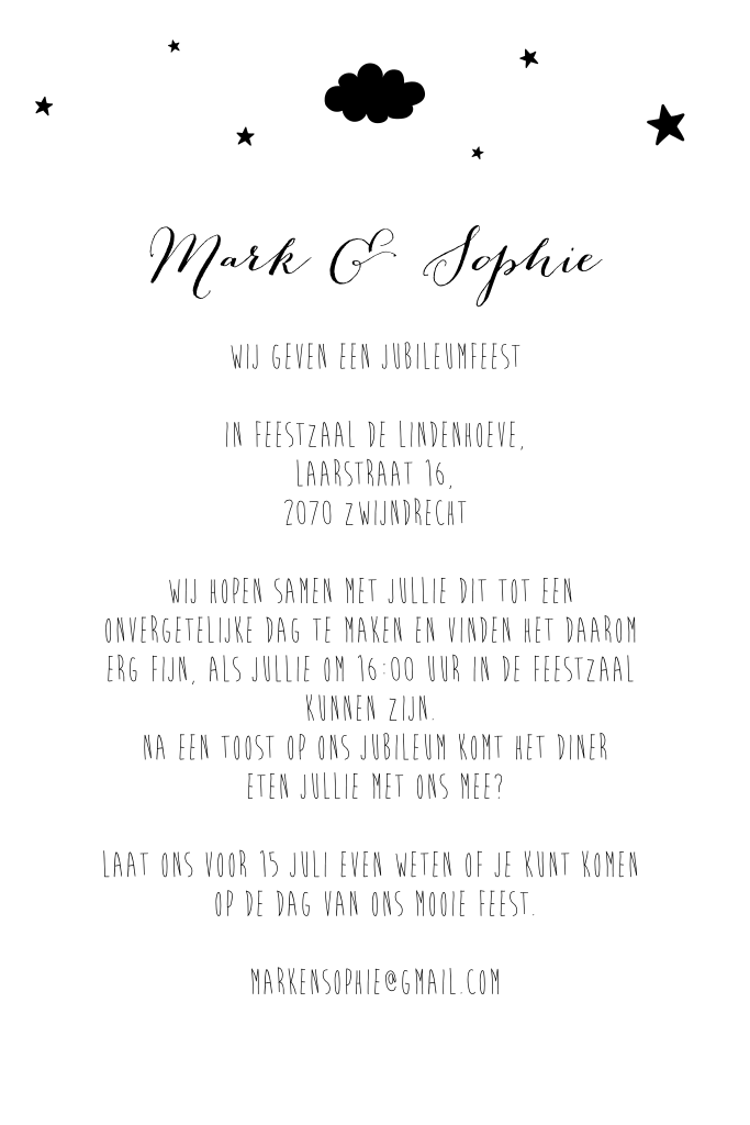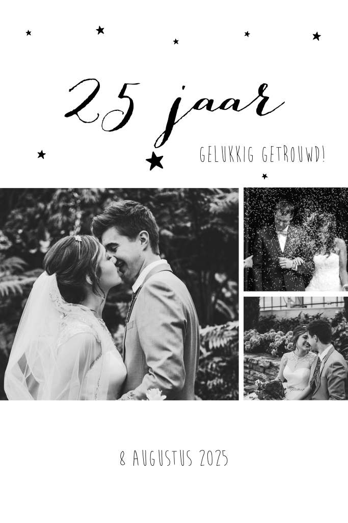 Een hippe kaart in zwart-wit om iedereen uit te nodigen voor jullie 25 jarig huwelijksfeest. Op de voorkant is ruimte voor een collage van drie foto's en aan de binnenzijde kan ook nog een foto worden geplaatst. De trendy letters met de sterretjes op de achtergrond maken de kaart helemaal af. In de online editor maak je de kaart persoonlijk met eigen foto's en tekst, daar pas je eventueel ook het lettertype aan naar eigen wens.