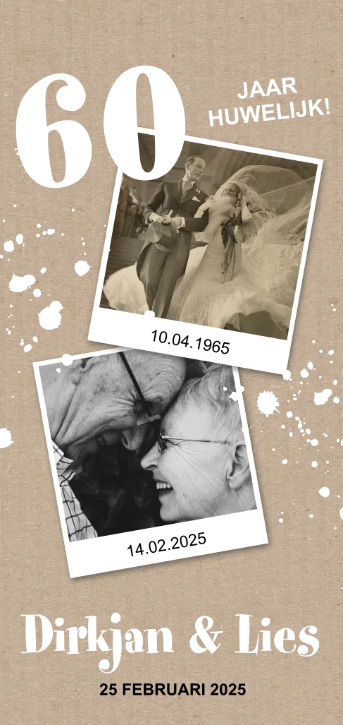 Feestelijke uitnodiging met kraftlook voor jullie zestigste huwelijksverjaardag. De twee foto's van vroeger en nu maken deze kaart ontzettend persoonlijk. De namen en details in goudfolie maken het helemaal af!