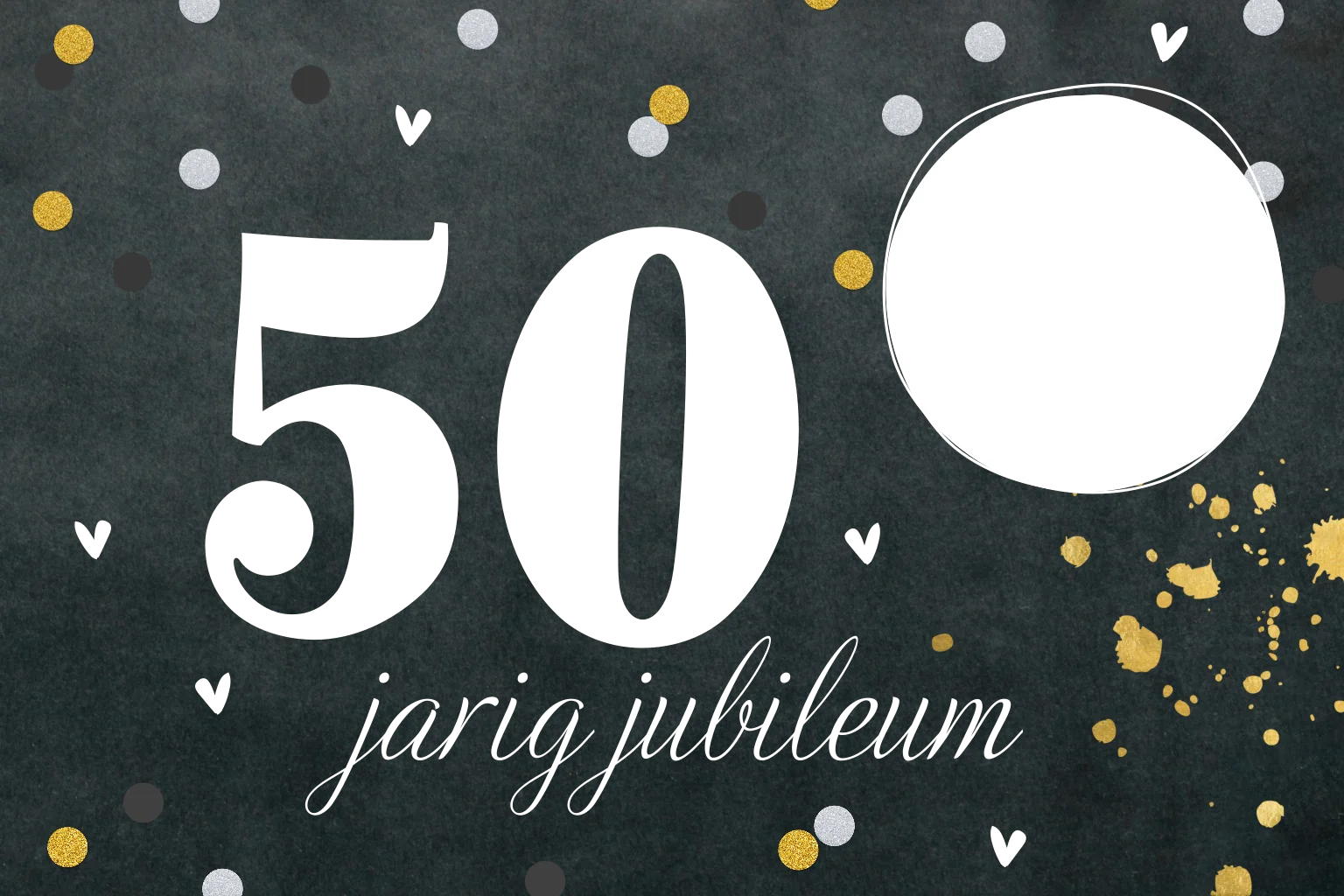 Feestelijke uitnodigingskaart voor jullie 50-jarig huwelijksfeest. Op een krijtbord achtergrond staan kleine hartjes en stippen. De grote tekst in goudfolie is niet te missen: tijd voor een feest! In de witte cirkel staan de namen van het bruidspaar in een sierlijk lettertype. Pas deze kaart naar wens aan in de online editor.