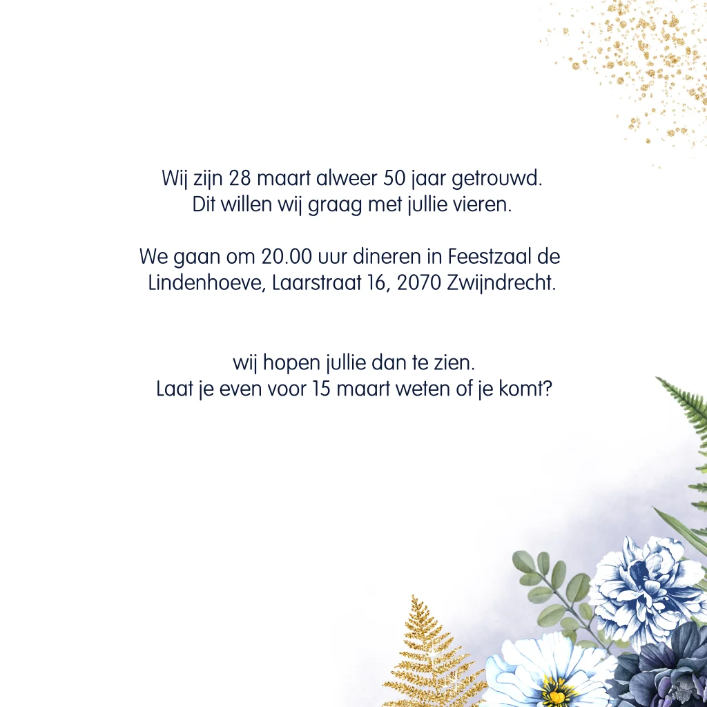 Zijn jullie binnenkort 50 jaar getrouwd? Wat een mijlpaal! Dat moet zeker gevierd worden. Laat dit weten aan vrienden en familie door middel van deze klassieke uitnodiging. Het goudfolie is een mooie combinatie met de bloemen en takjes en de confetti in de hoeken maakt het helemaal feestelijk! In het kader aan de binnenkant is ruimte om een eigen foto te uploaden, in de online editor maak je de kaart persoonlijk en voeg je ook eigen tekst toe.