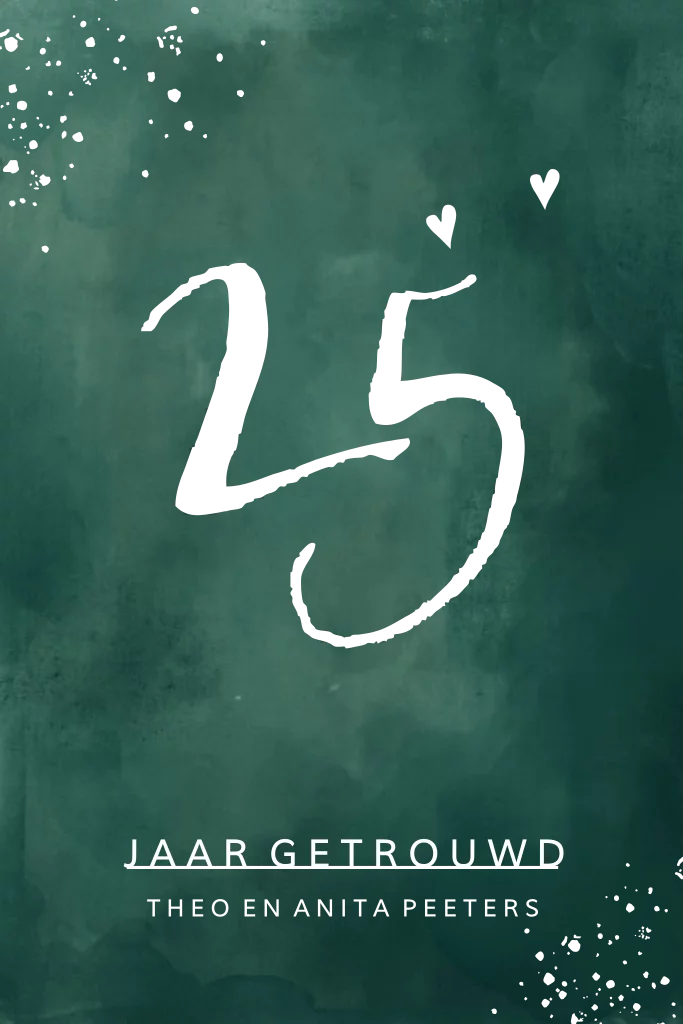 Chique kaart voor jullie 25 -jarig jubileum. De tekst, hartjes en spetters in goud op de donkergroene achtergrond maken het tot een stijlvolle uitnodiging. In de online editor pas je eenvoudig het ontwerp aan naar eigen wens.
