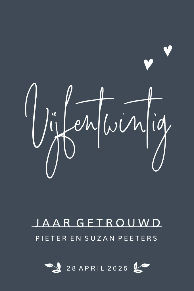 Hippe jubileumkaart voor jullie 25-jarig jubileum. De sierlijke letters, hartjes en jullie namen op de voorkant worden gedrukt in goudfolie en maken deze kaart extra bijzonder! Het goud op een donkergrijze achtergrond geeft de kaart een stijlvolle uitstraling.