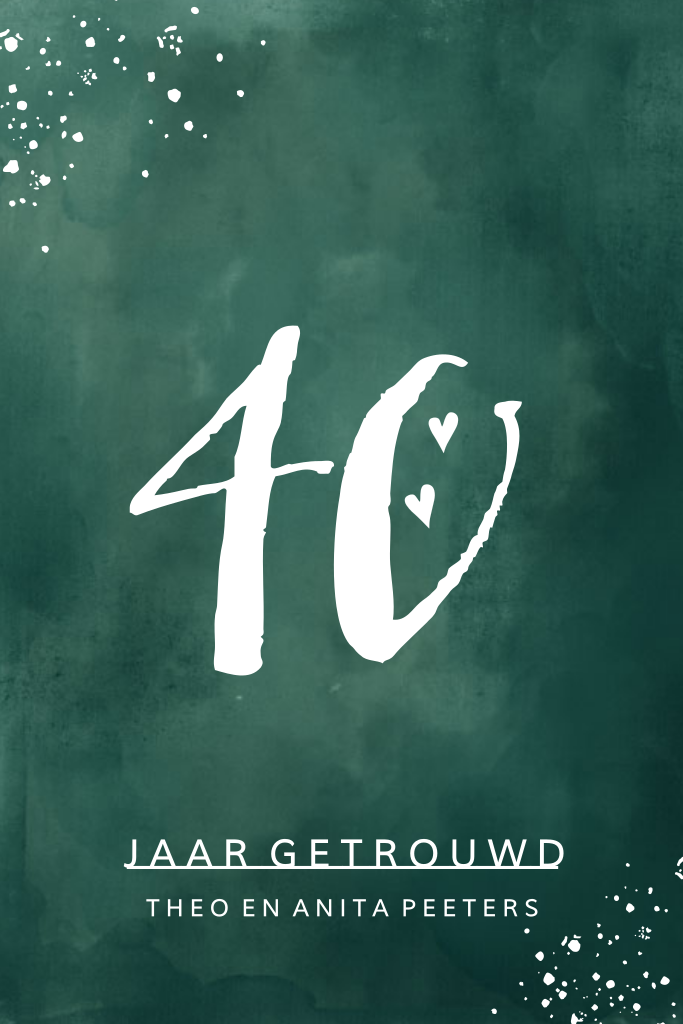 Stijilvolle kaart voor een huwelijksjubileum met spetters en goudfolie op een donkergroene watercolour achtergrond. Deze kaart heeft een chique uitstraling met de hartjes en tekst in goudfolie. Bewerk dit ontwerp naar wens in de online editor.