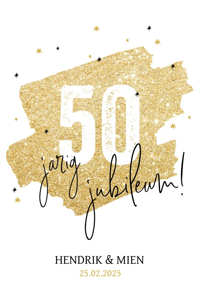 Een hippe uitnodiging voor een 50-jarig huwelijksjubileum. De gouden verfstrepen met glitters zijn een mooie achtergrond voor het getal dat zo belangrijk is: 50 jaar getrouwd zijn is een enorme mijlpaal! Maak de teksten persoonlijk in de online editor en de kaart is klaar om naar familie en vrienden te sturen, zo gedaan!
