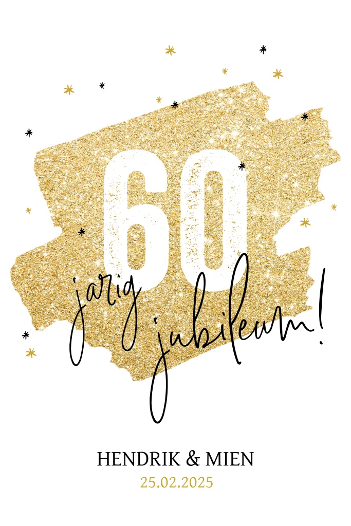 Feestelijke uitnodigingskaart voor een 60-jarig jubileum met een gouden glitter verfstreep op een witte achtergrond. Bij de tekst staan leuke zwart en gouden sterretjes. Voeg eigen teksten aan deze kaart toe in de online editor en maak de kaart zo persoonlijk.