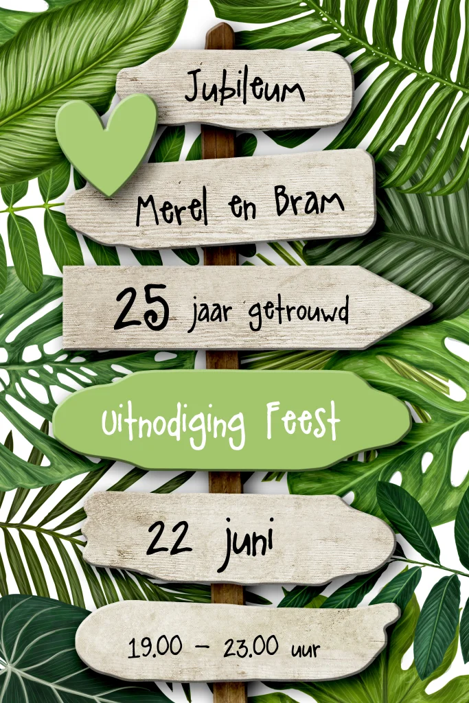Uitnodiging 25 jaar getrouwd met tropische bladeren en wegwijzer