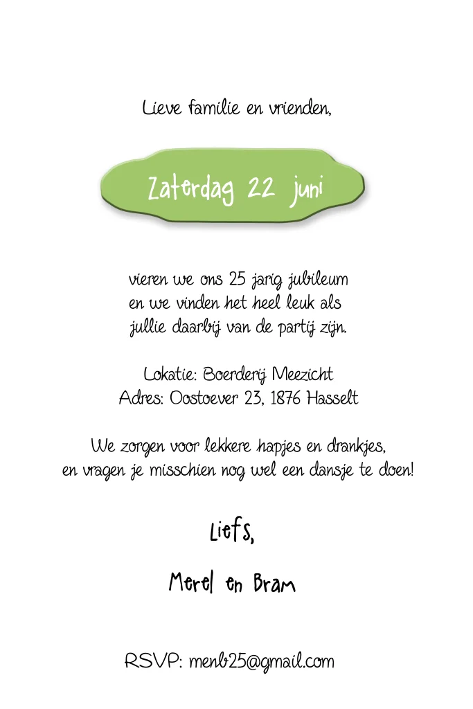 Botanische kaart met een houten wegwijzer voor een 25-jarig huwelijk, maar deze kaart kan gebruikt worden voor ieder feestje. In de online editor kun je zelf de teksten aanpassen. Aan de binnenzijde is de kaart ook botanisch geïllustreerd en er is ruimte voor het toevoegen van een mooie foto om de kaart helemaal persoonlijk te maken.