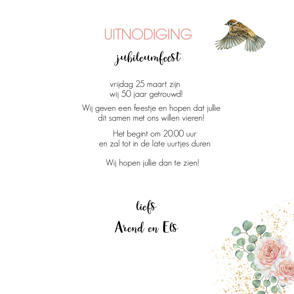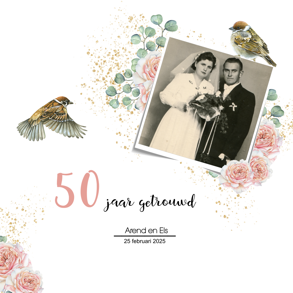 Een romantische uitnodiging voor een 50-jarig huwelijksjubileum. De vierkante uitnodiging heeft een design met bloemen, vogeltjes en gouden verfspetters. Op de voorkant van de kaart is ruimte voor een foto van het bruidspaar. Je kunt kleuren, teksten en afbeeldingen zelf aanpassen in de online editor. Zo gedaan!