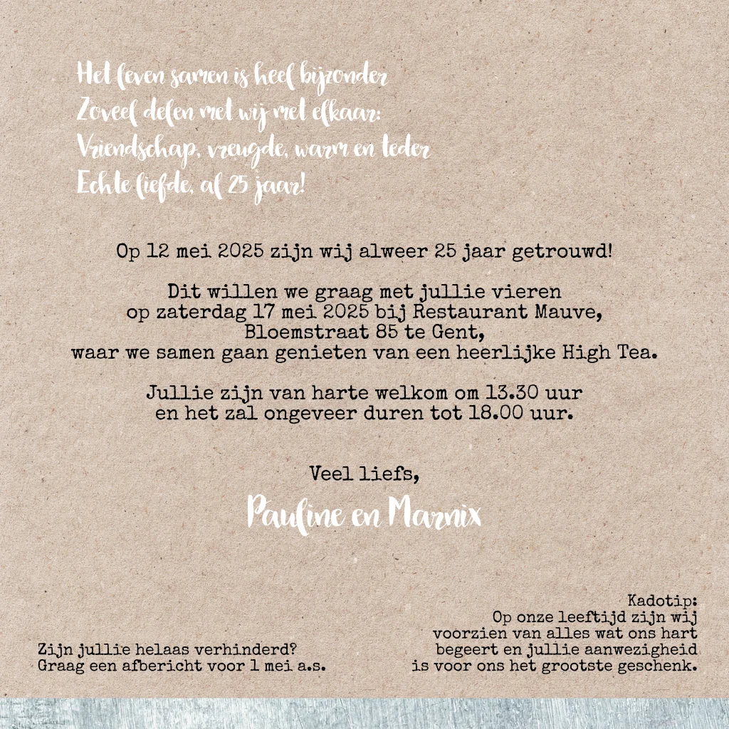Stoere uitnodiging 25 jarig huwelijksfeest hout met kraft foto labels