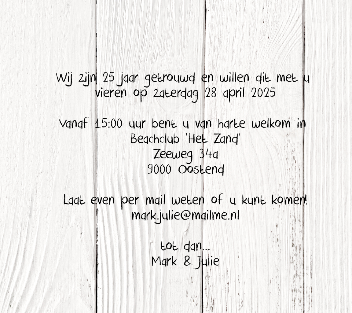 Krijg jij ook een beetje een strandgevoel bij deze uitnodiging met de houten wegwijzer? Hoe leuk is het om al je geliefden uit te nodigen voor bijvoorbeeld een leuk strandfeestje om jullie 25-jarig huwelijk te vieren! De achtergrond van de kaart is in houtlook, de teksten op de wegwijzer en aan de binnenkant zijn eenvoudig zelf aan te passen in de online editor.