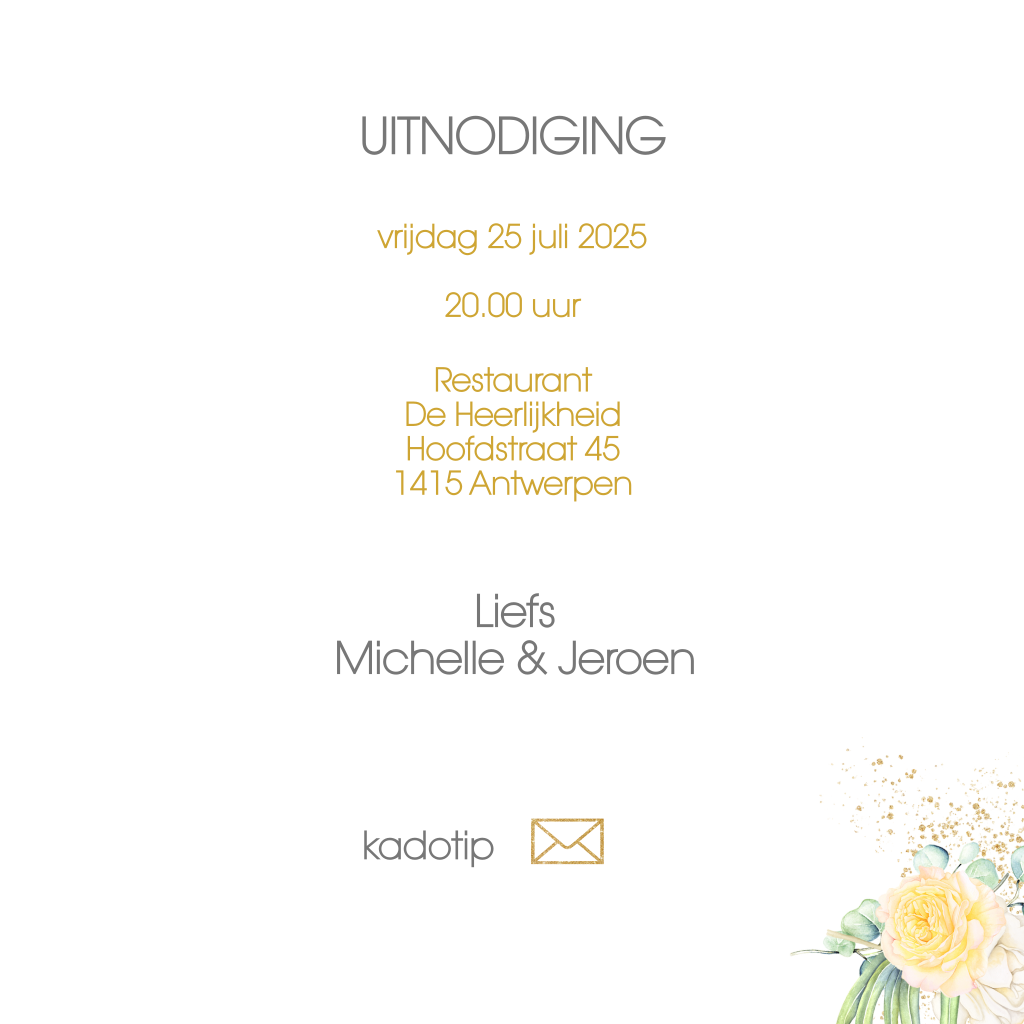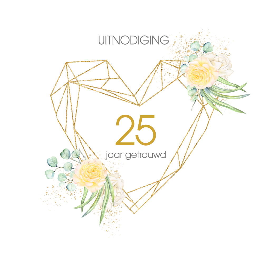 Stijlvolle uitnodiging voor een 25-jarig huwelijksjubileum met een geometrisch hartje met gouden lijnen. Op het hartje mooie illustraties van waterverf bloemen en takjes. Je kunt de kleuren zelf aanpassen in de online ontwerptool.