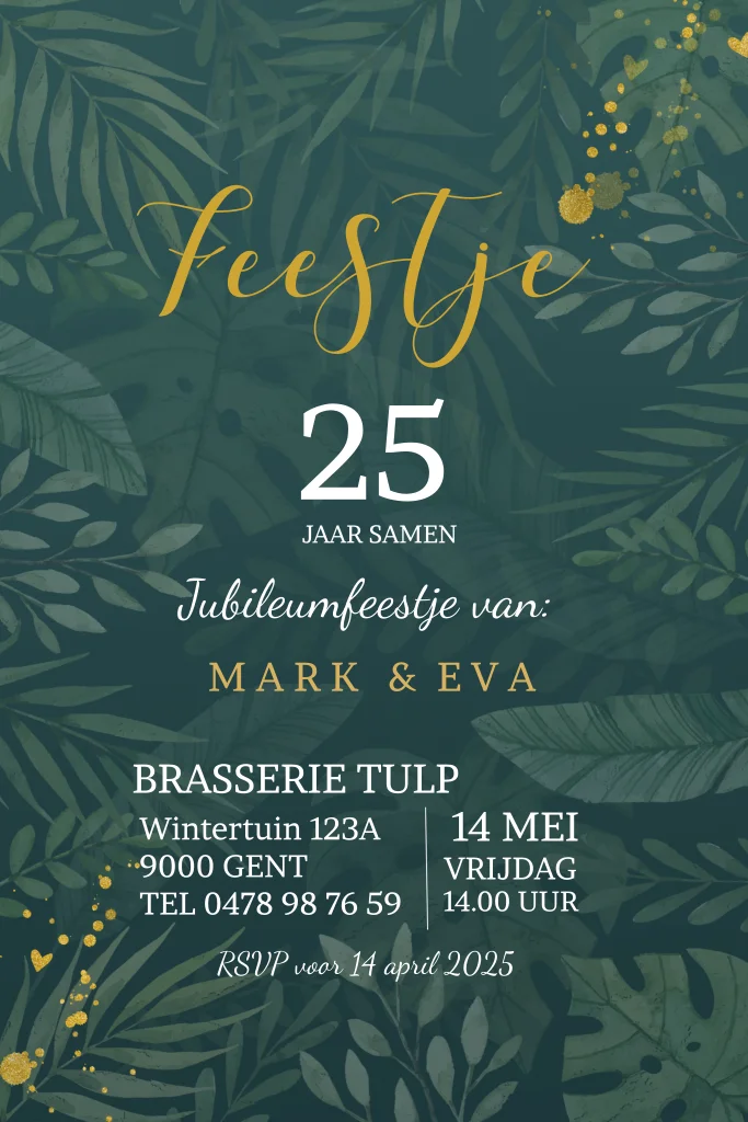 Hippe uitnodiging 25 jarig huwelijk met botanische bladeren