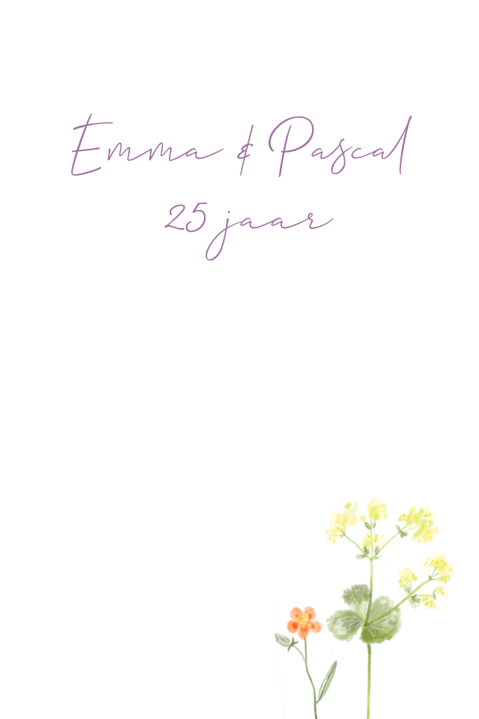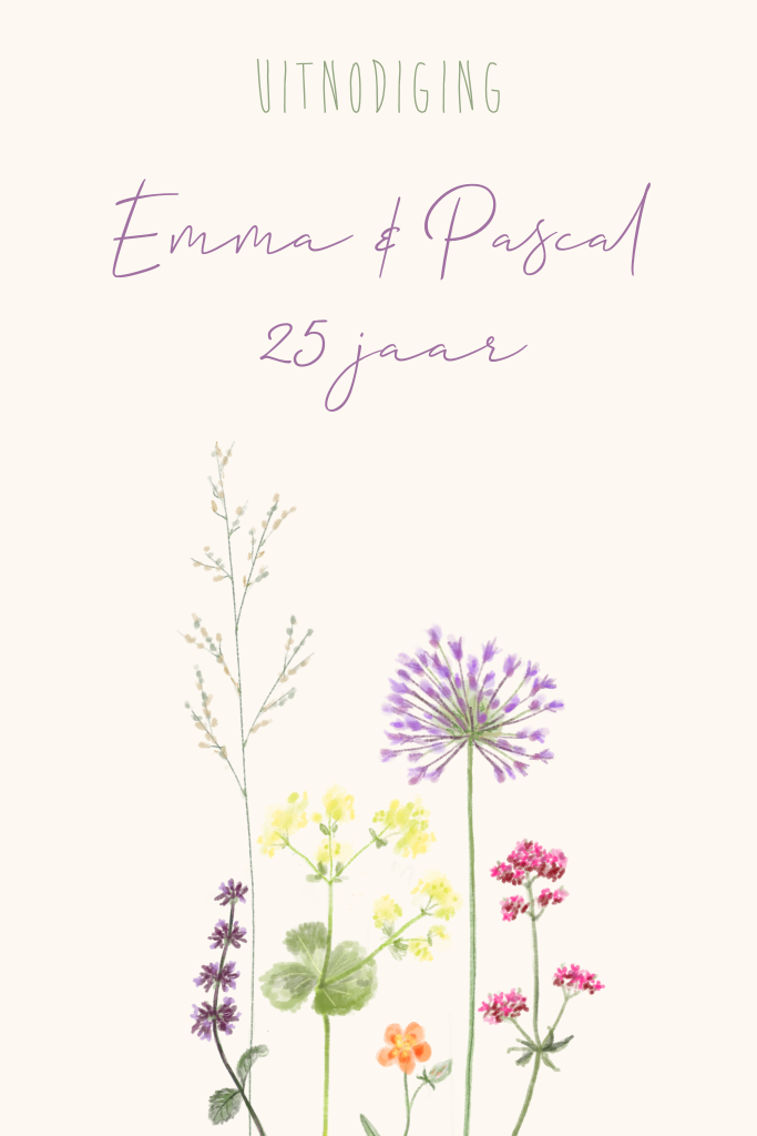 Een vrolijke uitnodiging voor een 25-jarig huwelijksfeest met een rand van kleurrijke veldbloemen op een pastelkleurige kaart. De bloemen staan ook aan de binnenzijde, de tekst is in bijpassende kleuren en kan eenvoudig zelf worden aangepast in de online editor.