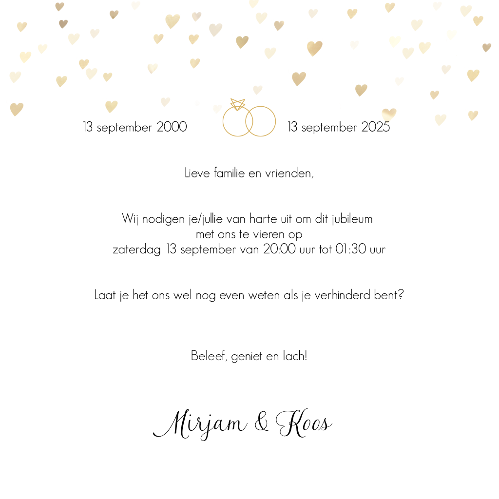 Uitnodiging 25e huwelijksjubileum met goudlook hartjes en foto