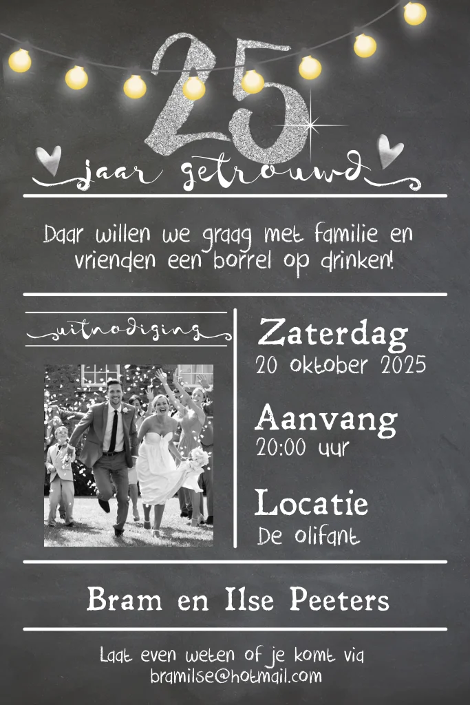 Hoera, 25 jaar getrouwd! Reden voor een gezellig feestje. Deze trendy uitnodigingskaart met krijtbord-achtergrond is versierd met een sfeervolle lampjesslinger en de tekst staat in handlettering-stijl. Met een leuke foto van het jubilerende paar wordt het een unieke kaart. In de online editor maak je de kaart persoonlijk met eigen tekst en foto en kies je eventueel andere lettertypes.