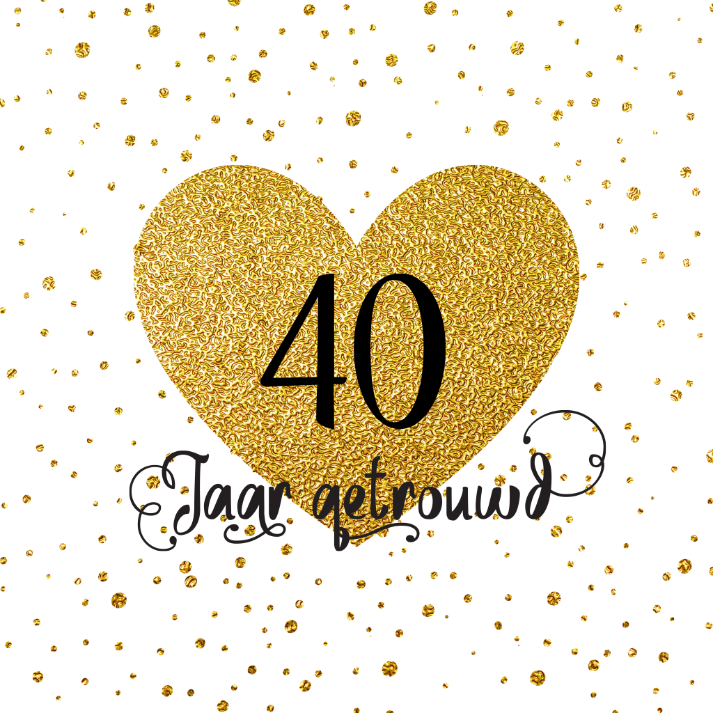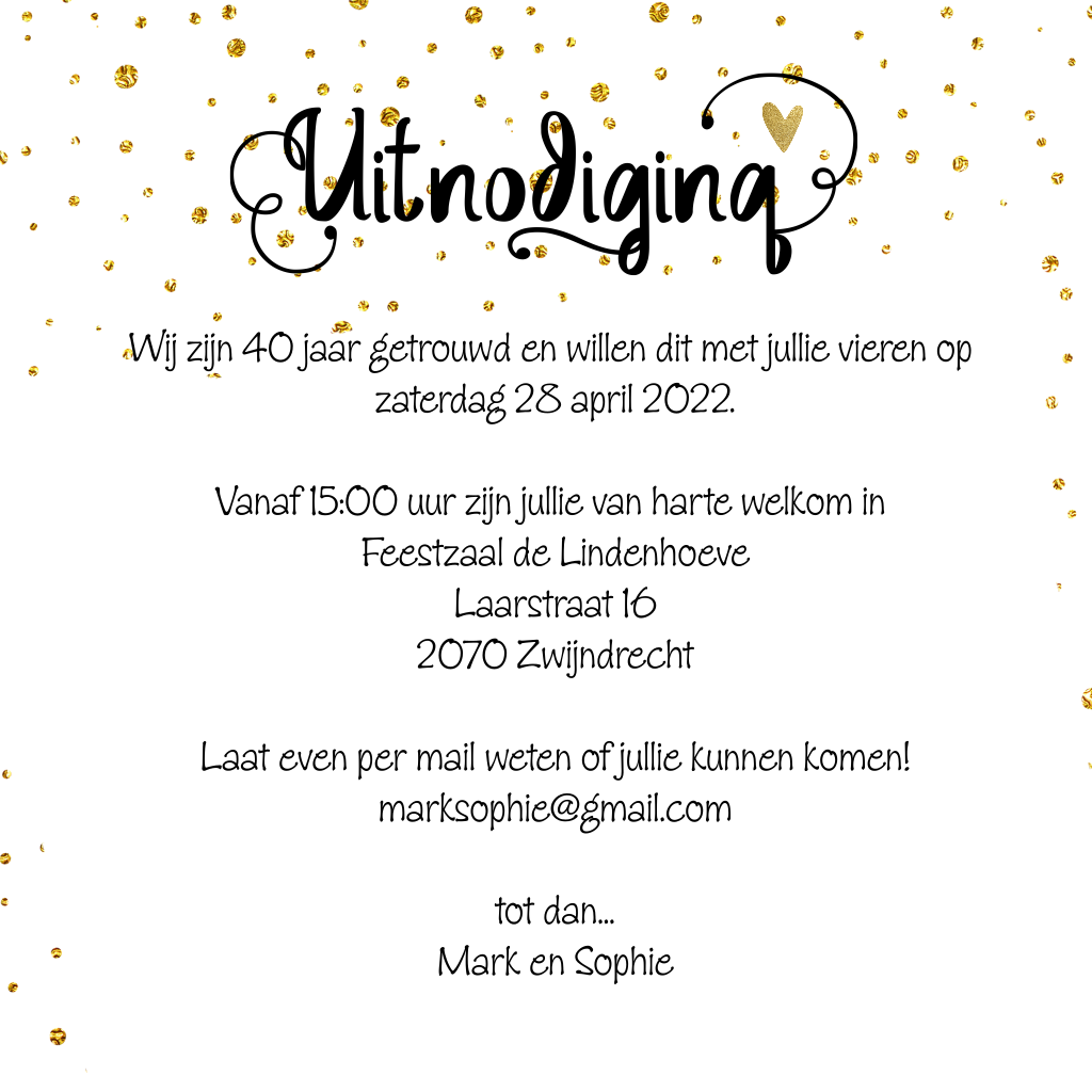 Een stijlvolle en feestelijke uitnodiging voor jullie 40-jarige huwelijk. In het midden een gouden glitter hart met 40 op een achtergrond van goudkleurige confetti. De sierlijke letters maken de kaart compleet. Liever een andere kleur of lettertype? Dit kun je naar eigen wens aanpassen in de online editor.