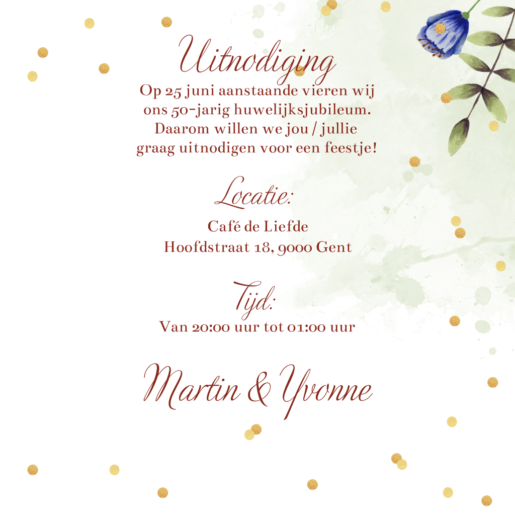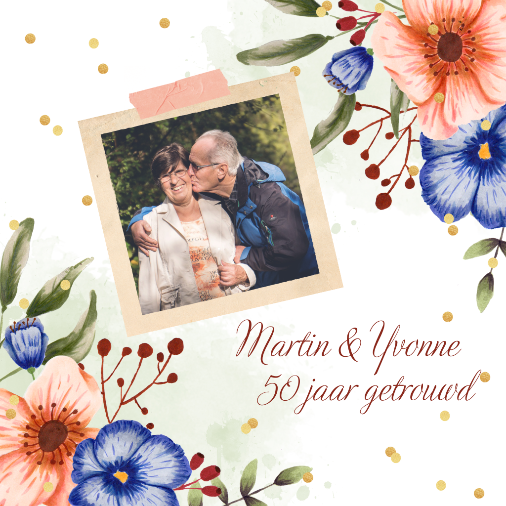 Stijlvolle uitnodiging 50 jarig huwelijk met foto, bloemen en confetti