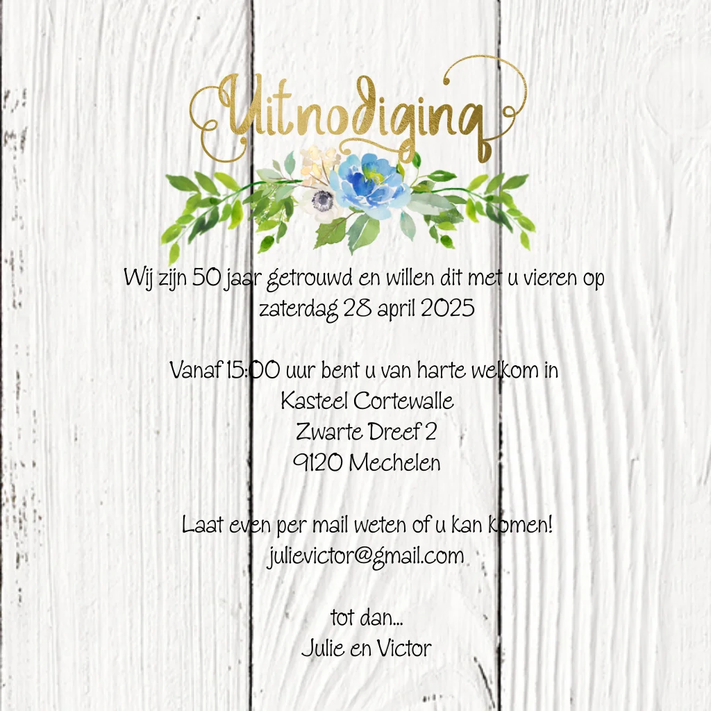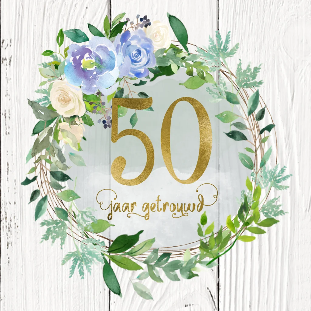 Binnenkort 50 jaar getrouwd? Tijd voor een feestje! Laat vrienden en familie weten dat jullie deze bijzondere gebeurtenis niet zonder hen willen vieren. De achtergrond van dit kaartje is in houtlook. In de bloemenkrans in paars, groen en wit staat '50' in goudkleurige cijfers.