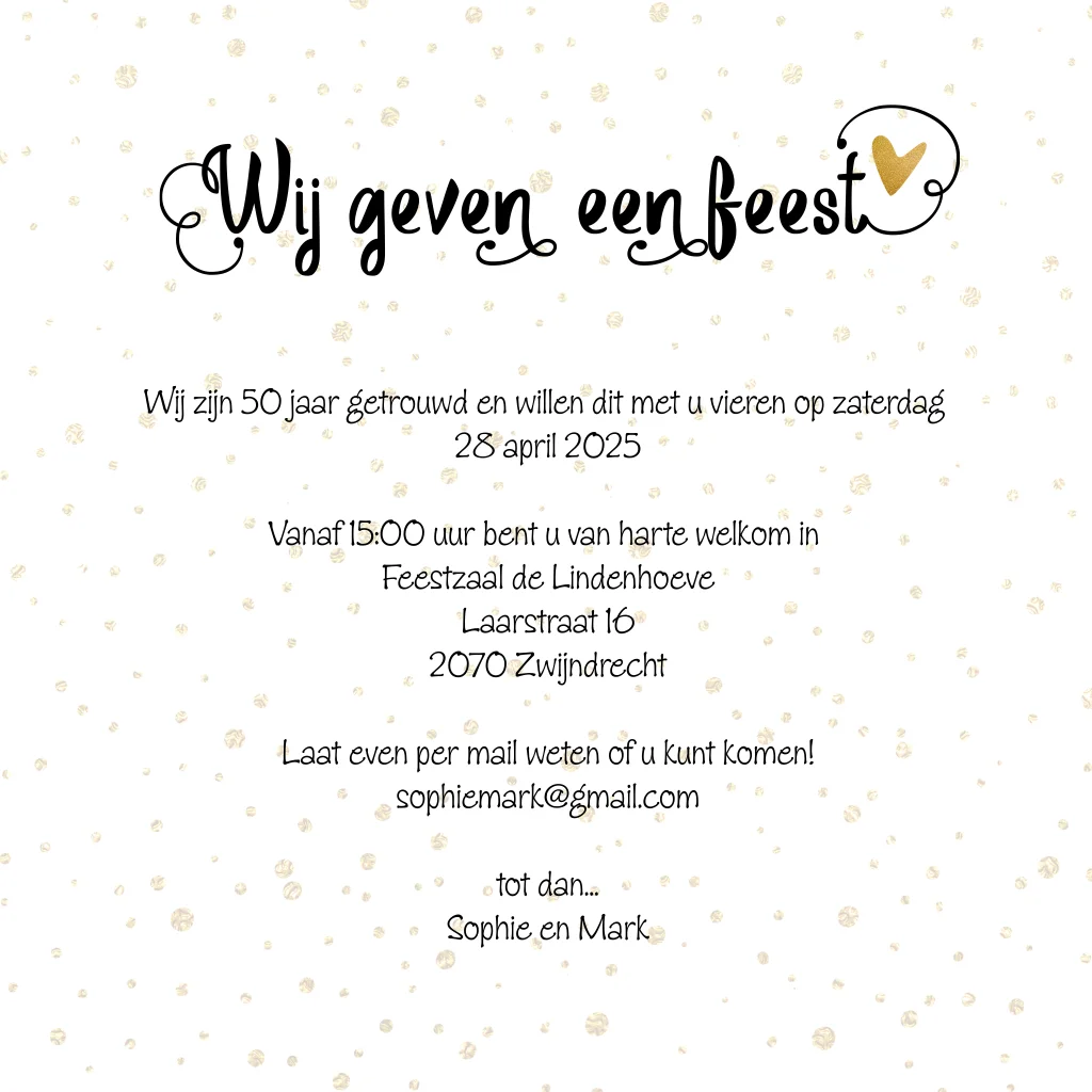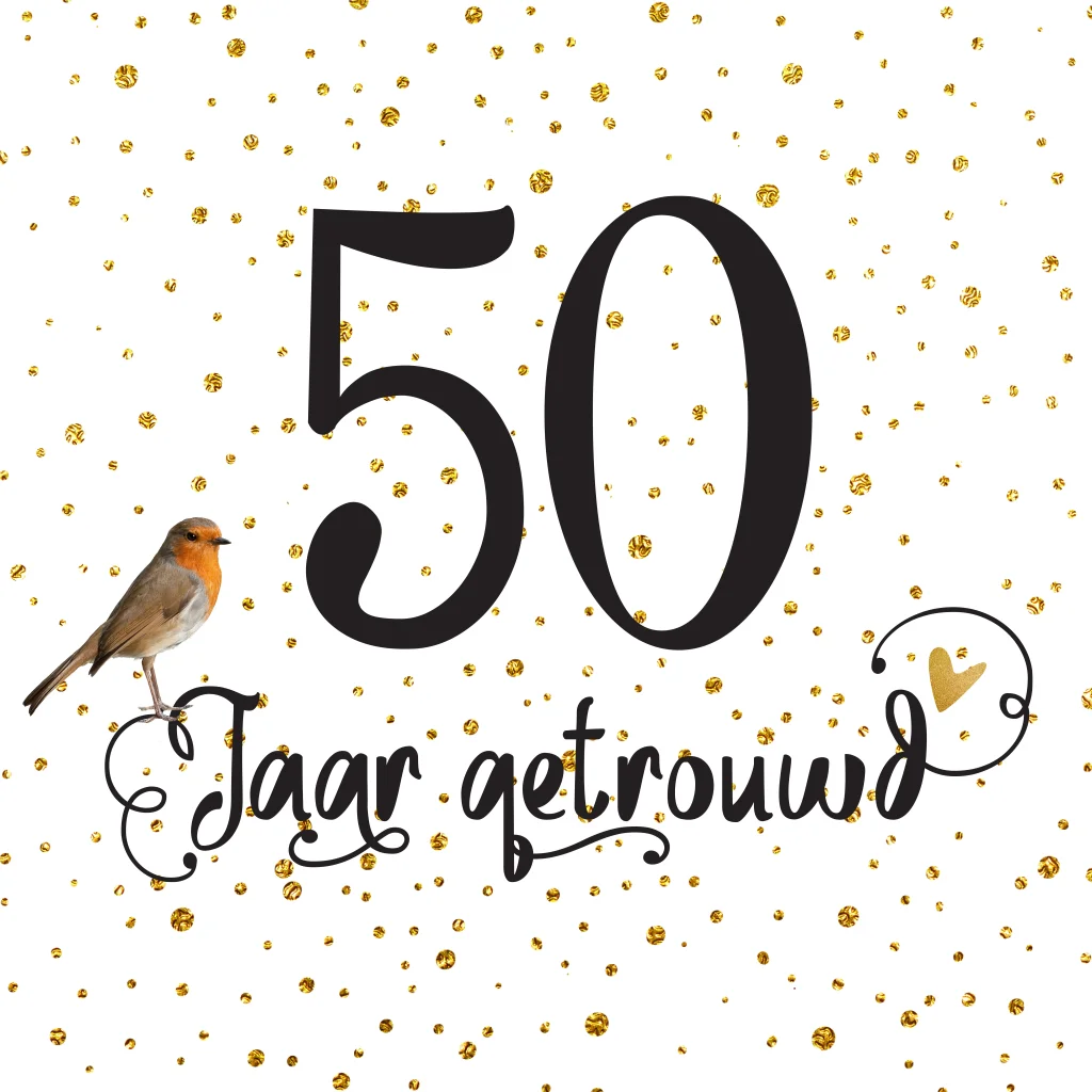 Een feestelijke uitnodiging voor jullie 50-jarige huwelijk met goudkleurige confetti op de achtergrond. Bij de tekst staat een lief roodborstje en een hartje. Aan de binnenzijde is ruimte om een mooie foto toe te voegen, maak de kaart helemaal naar eigen wens in de online editor.