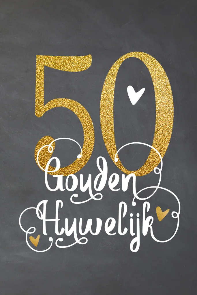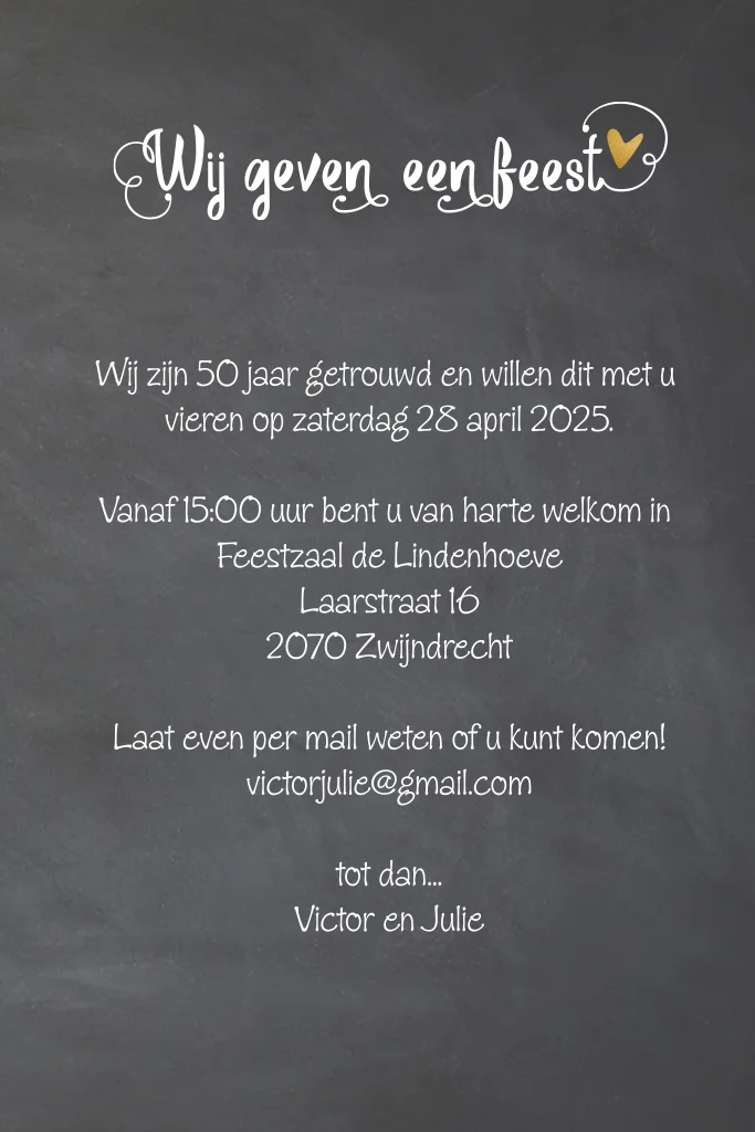 Zijn jullie binnenkort 50 jaar getrouwd? Alvast gefeliciteerd! Nodig al jullie familie en vrienden uit voor deze bijzondere gebeurtenis. De achtergrond van deze kaart heeft een krijtbord look. Het getal '50' staat prominent in het midden van de kaart in gouden glitters. De paar hartjes maken het geheel helemaal af. Aan de binnenzijde is ruimte om jullie mooiste foto te plaatsen, pas de kaart eenvoudig naar wens aan in de online editor.