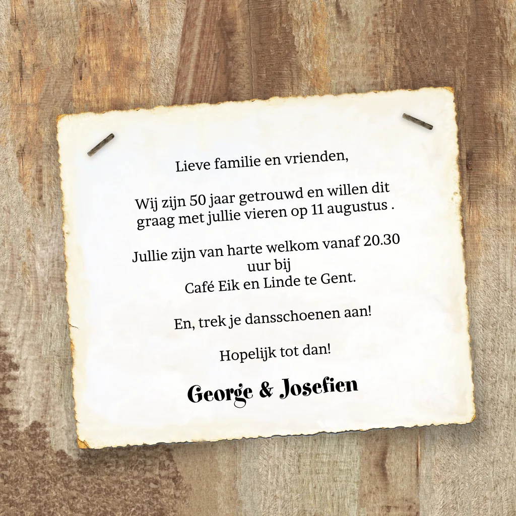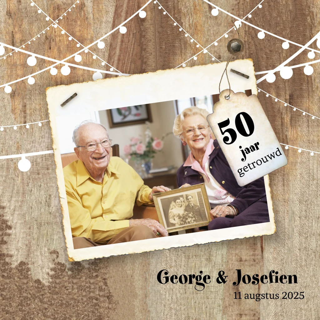 Uitnodiging 50 jarig huwelijksjubileum met hout, foto en slingers