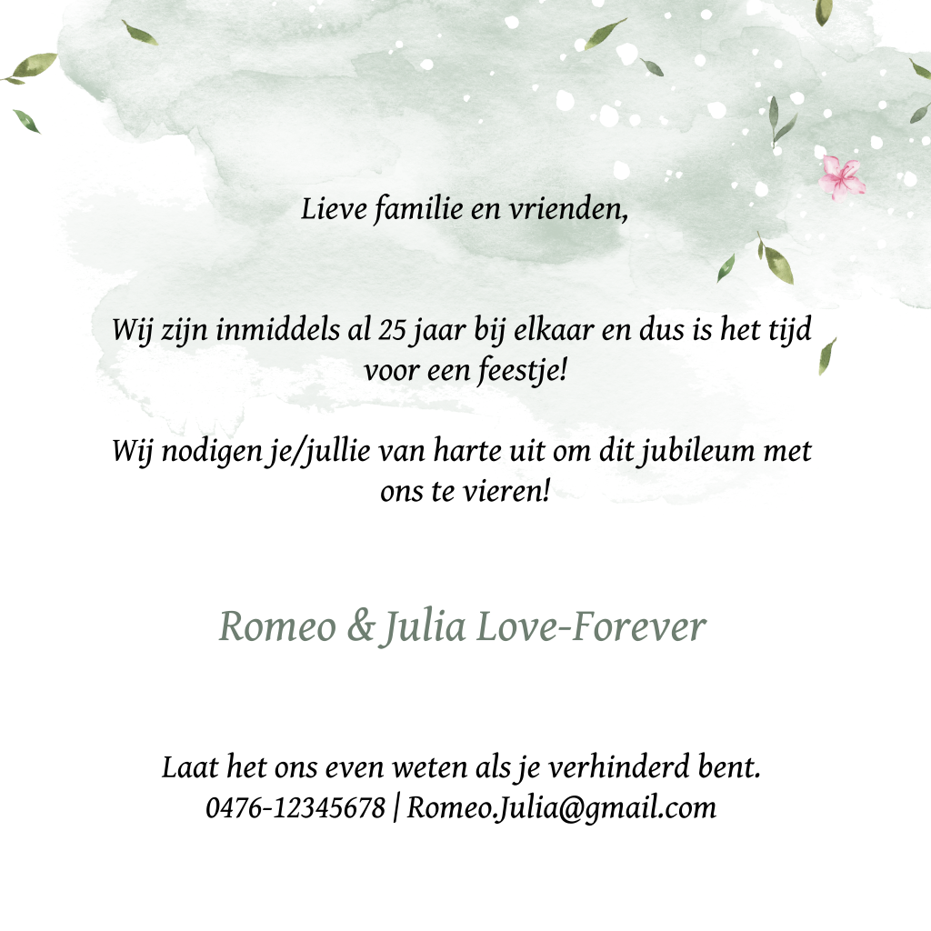 Hippe uitnodiging voor jullie 25-jarig huwelijksfeest met een achtergrond van mintgroene waterverf. In het midden kun je een mooie eigen foto uploaden, zo maak je de kaart persoonlijk! Op de achtergrond vrolijke blaadjes, bloemetjes en hartjes in groen en roze. Met een leuk lettertype maak je de feestelijke kaart compleet, kijk in de online editor wat bij jullie past en pas de kaart eenvoudig aan.