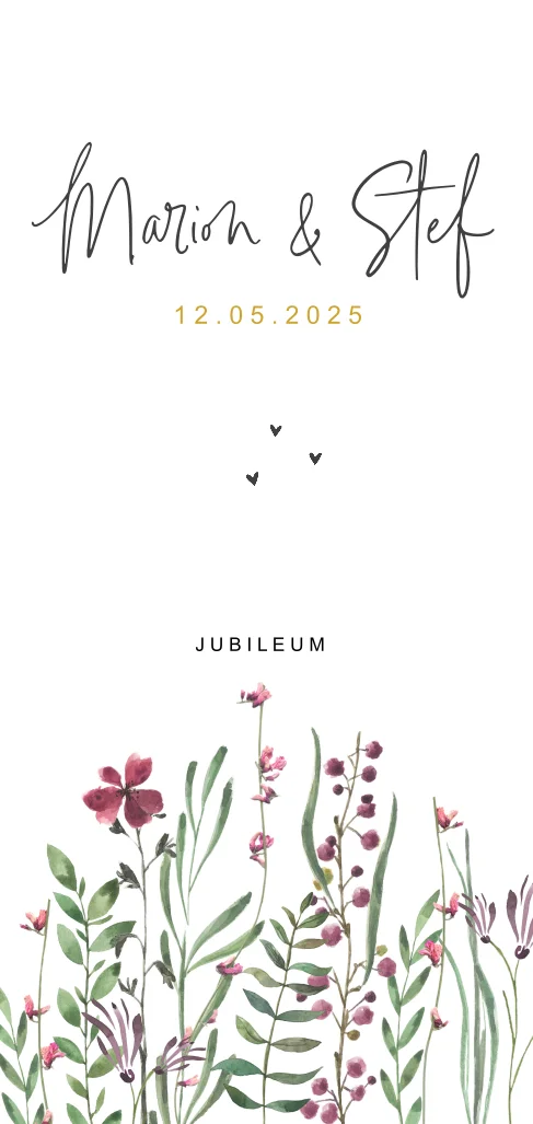 Stijlvolle uitnodiging voor een huwelijksjubileum. Op deze langwerpige kaart is onderaan een rand van kleurrijke veldbloemen te vinden. Bovenaan de namen van het jubilerende paar in een speels lettertype en de kleine hartjes zorgen voor een romantische touch. In de online editor kies je je eigen stijl en voeg je persoonlijke tekst toe.