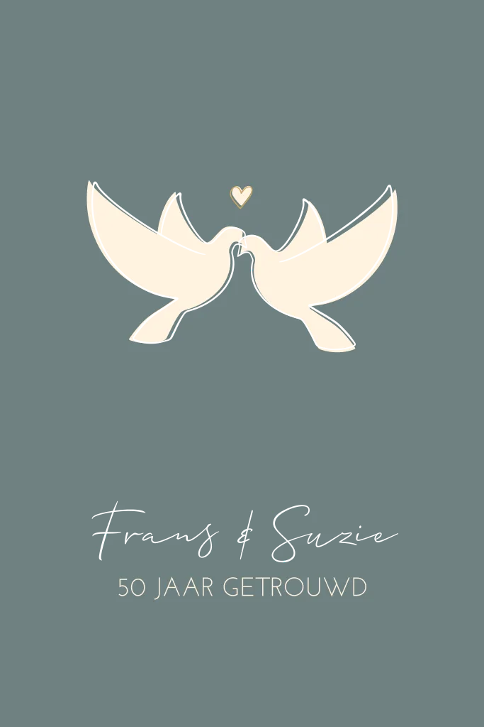 Romantische grijze jubileumkaart met twee witte duiven en een hartje erboven. De namen staan in goudfolie, voor een extra feestelijk effect, aan de binnenkant kan een eigen foto worden geplaatst, maak de kaart naar persoonlijke wens in de online editor.