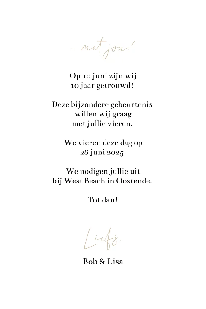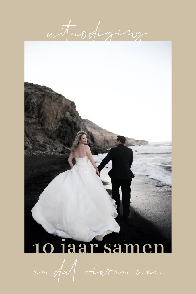 Stijlvolle jubileumkaart om familie en vrienden uit te nodigen voor een gezellig feestje! De kaart is in beige en wit, met tekst in bijpassende kleuren. Op de voorkant is ruimte voor een mooie foto, maak de kaart persoonlijk in de online editor.