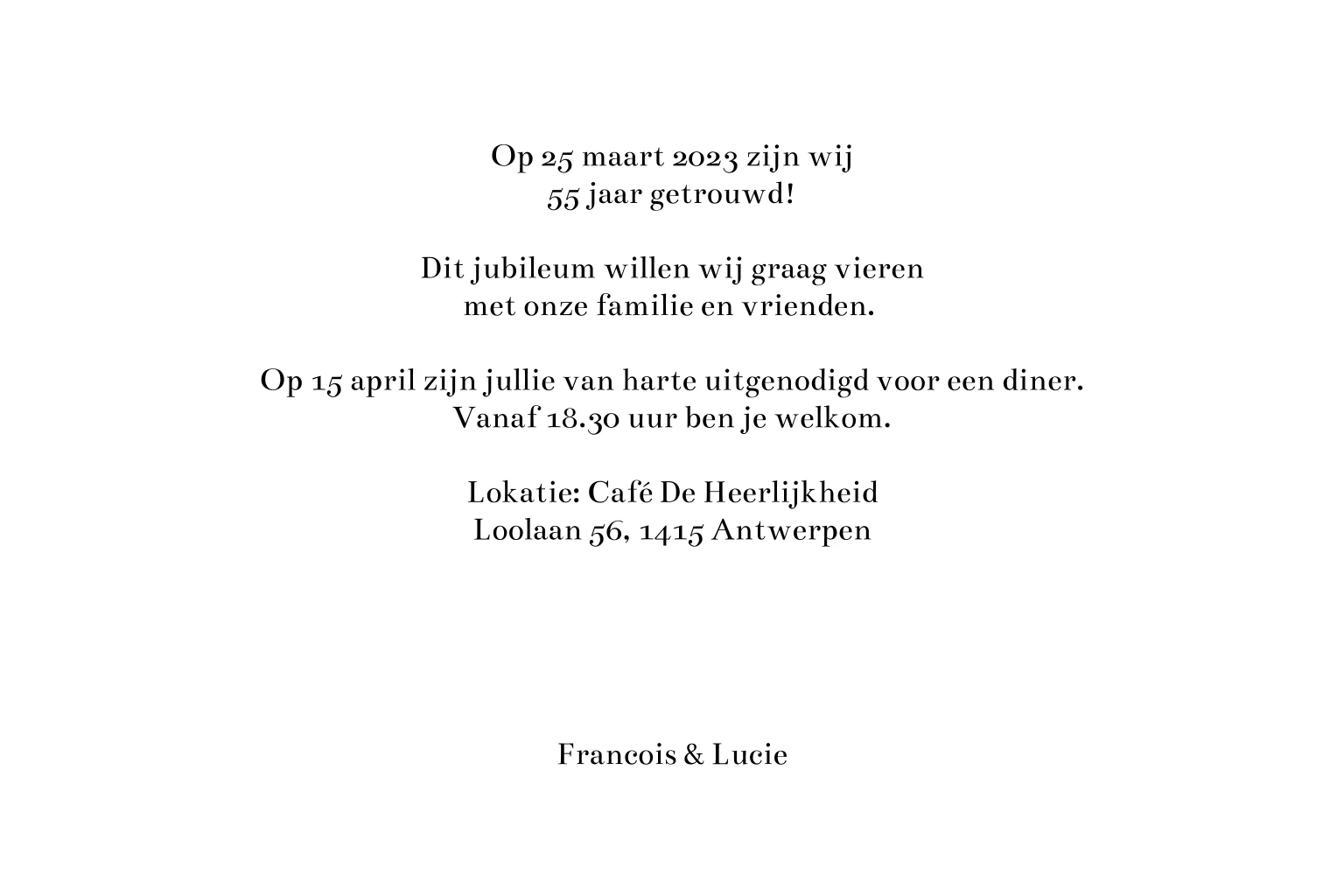 Een eenvoudige maar sierlijke jubileumkaart om vrienden en familie uit te nodigen voor jullie jubileum. De tekst op de voorkant van de kaart wordt in goudfolie gedrukt. Ook de tekst aan de binnenkant van de kaart staat in goudfolie.