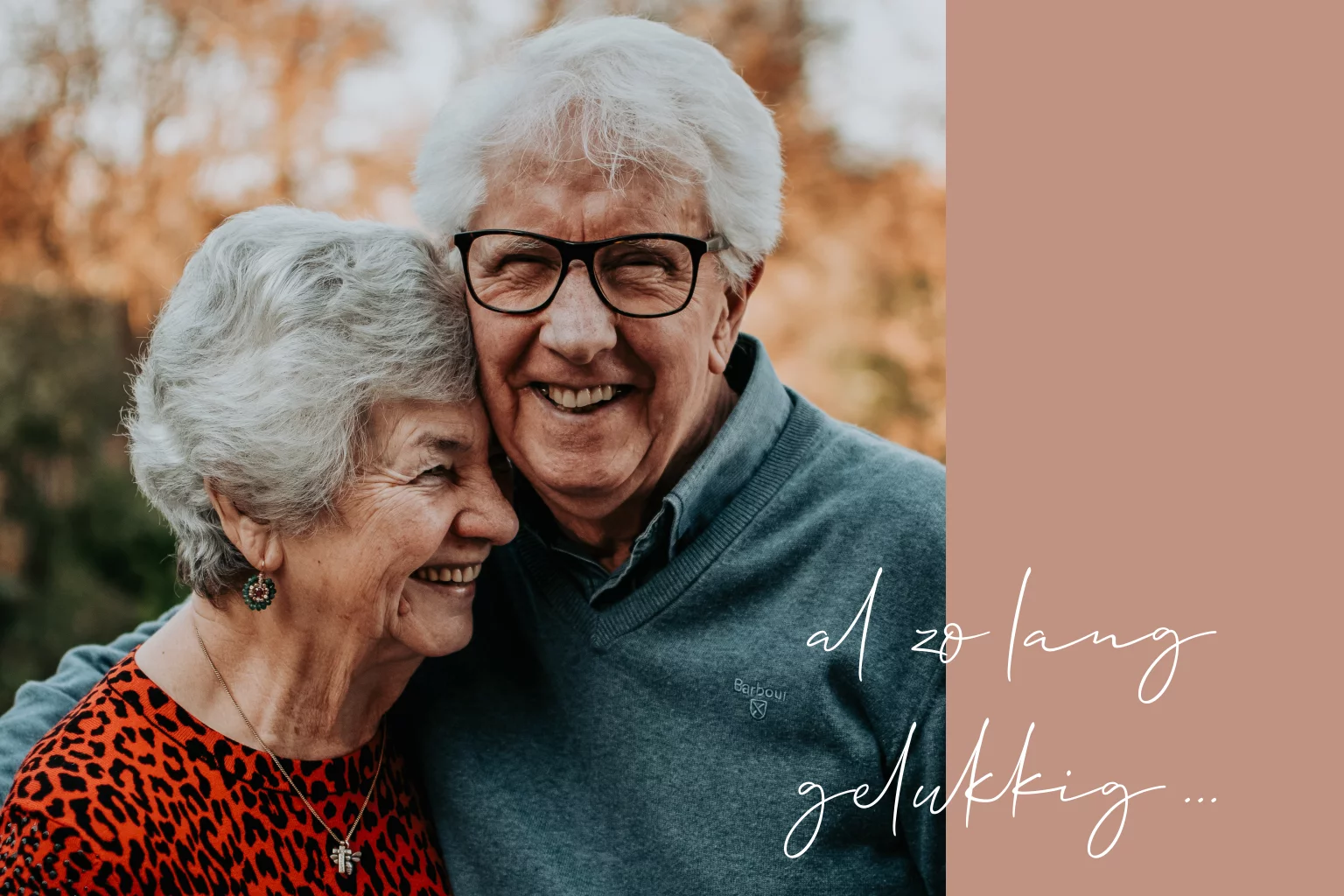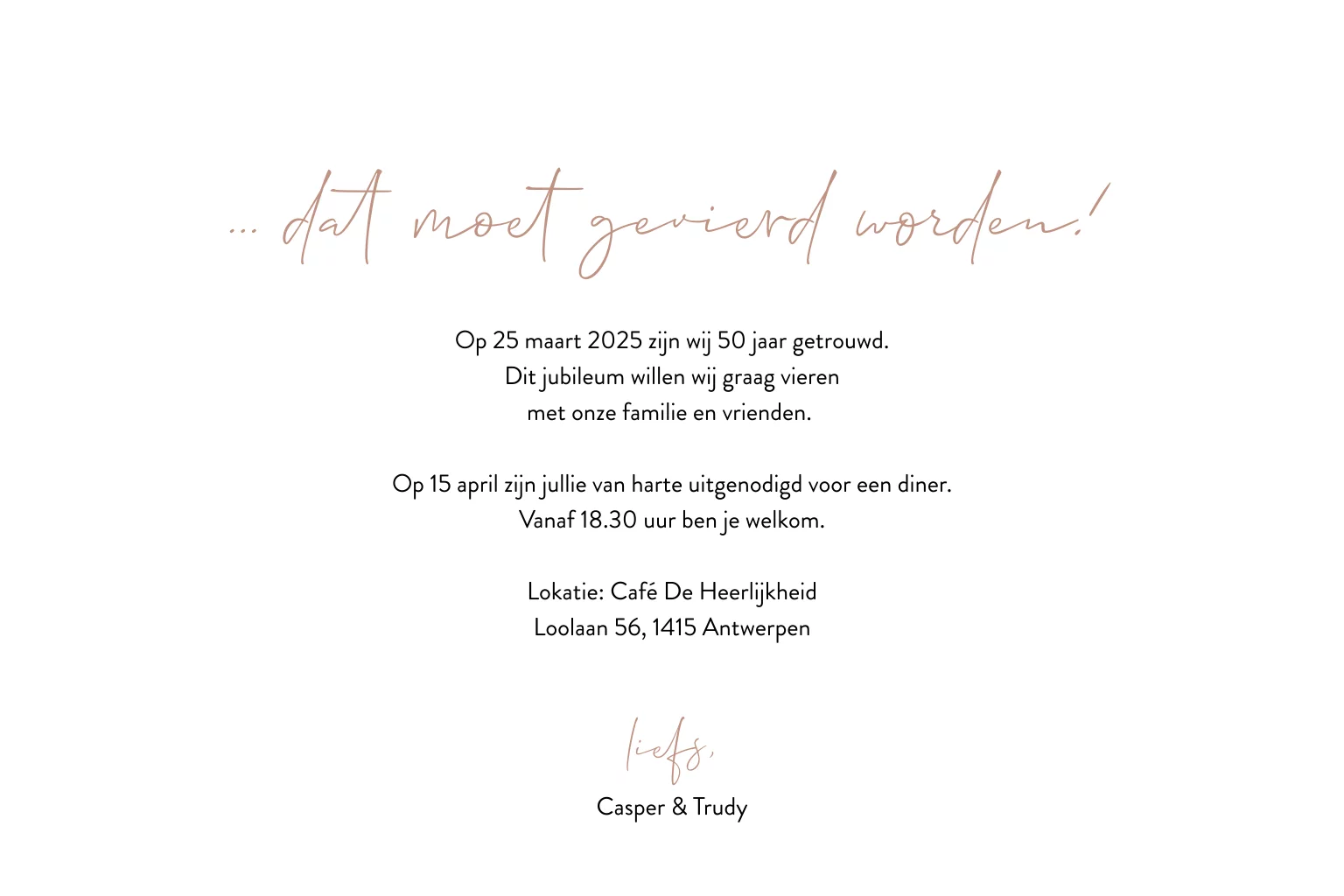 Een prachtige persoonlijke jubileumkaart om jullie trouwjubileum mee te vieren! De kaart is in oudroze en wit en de tekst is bijpassend, maak de kaart persoonlijk en naar eigen wens in de online editor voor een unieke uitnodiging.