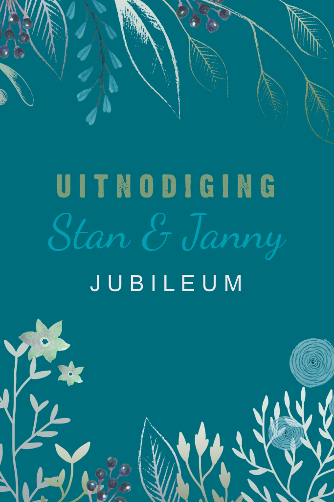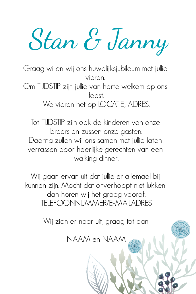 Nodig met deze hippe kaart je vrienden en familie uit voor het feest ter ere van jullie huwelijksjubileum! Op de petrol achtergrond staan getekende takjes en bloemen aan de rand. Maak de tekst persoonlijk in de editor en jullie kaart is klaar voor verzending!