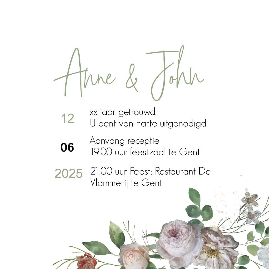 Chique kaart voor jullie jubileum met mooie bloemen en takjes op een zwarte achtergrond. De hippe lettertypes in het olijfgroen passen goed bij de takken en geven dit kaartje een romantische uitstraling. Het mooie bloemenpatroon komt ook terug op de rest van de kaart. Schrijf jouw eigen teksten in de online editor en maak dit kaartje uniek!