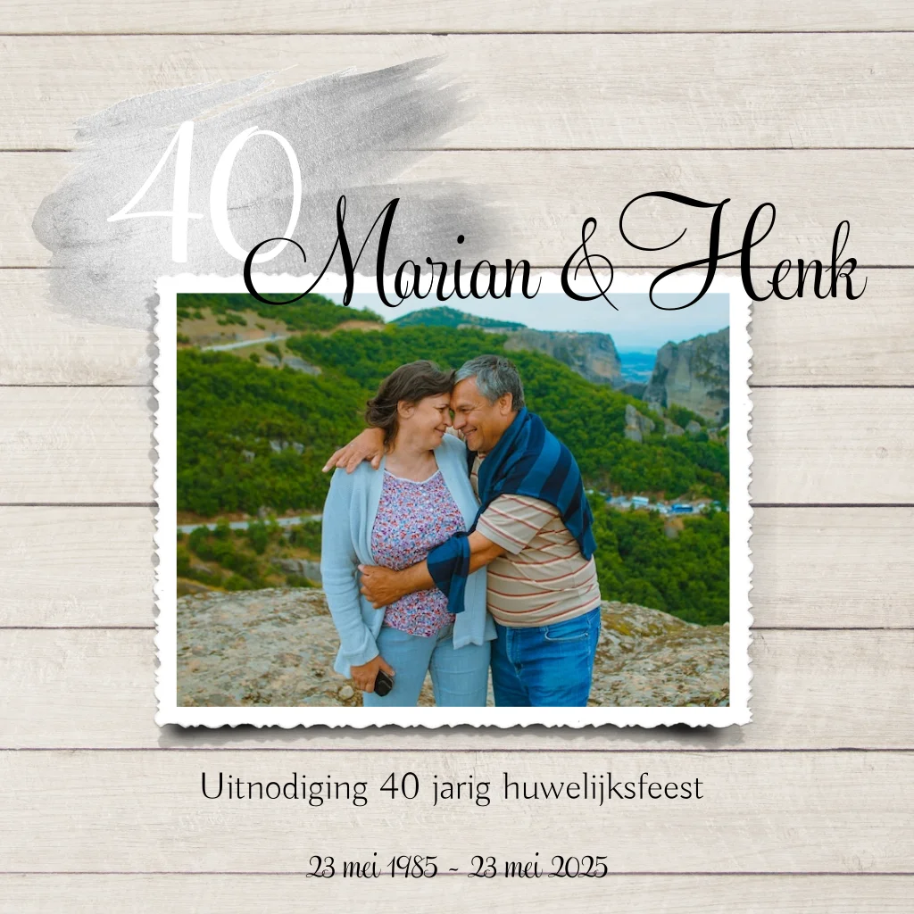 Stoere uitnodiging voor jullie 40-jarig huwelijksfeest met houtachtergrond, zilverveeg met '40' en een eigen foto. Het stijlvolle lettertype combineert hier mooi bij. Schrijf je eigen teksten in de online editor, upload een leuke foto en maak hem compleet met een bijpassende enveloppe!