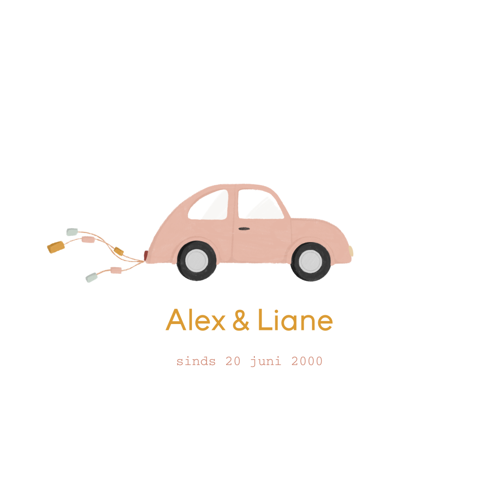 Een vrolijke jubileumkaart om jullie trouw jubileum te vieren en mensen mee uit te nodigen voor een feest. Op de witte kaart staat een grappig getekende roze auto met een blikjesslinger erachter. Pas de tekst gemakkelijk aan in de editor.