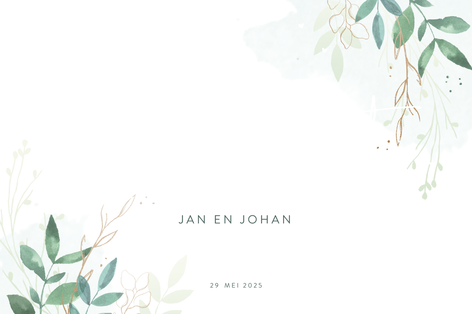 Kondig jullie jubileumfeest aan met deze stijlvolle uitnodiging. Er staat een aantal botanische elementen op dit kaartje in de vorm van watercolor takjes met bladeren. De trendy tekst en de kleine hartjes in roségoudfolie springen er echt uit en geven de kaart een luxe uitstraling.