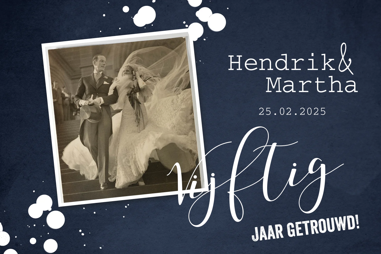 Een stijlvolle uitnodiging voor jullie 50-jarig huwelijksfeest in donkerblauw. Op de voorkant in het kader is ruimte voor een mooie foto van het bruidspaar. Met de confetti en sierlijke letters in zilverfolie is dit een feestelijke kaart!